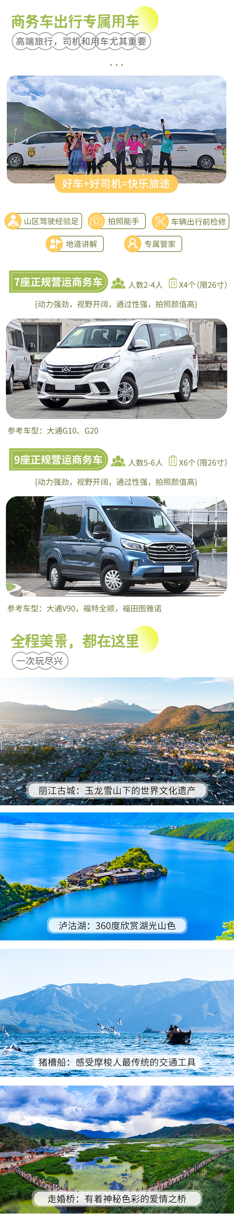 3、用车:2-4人安排7座商务车,5-6人安排9座商务车;