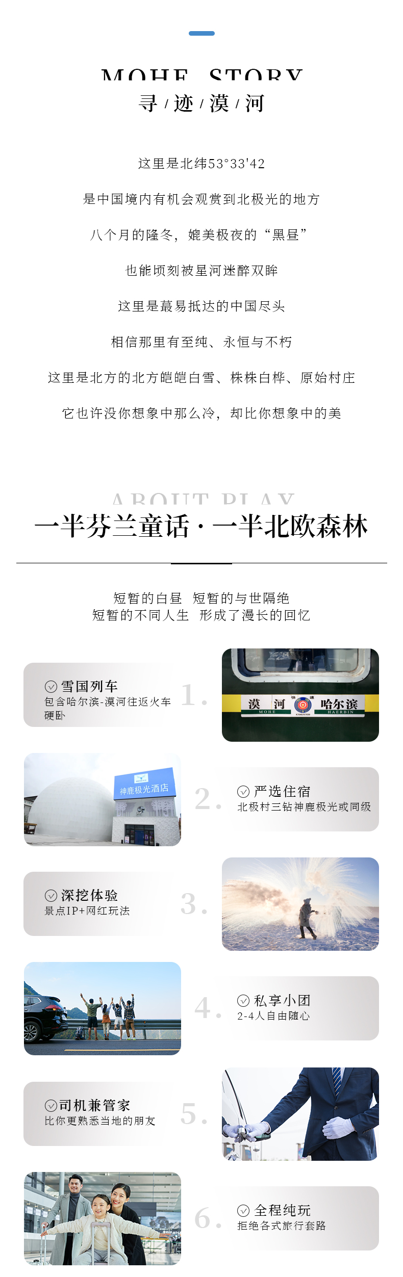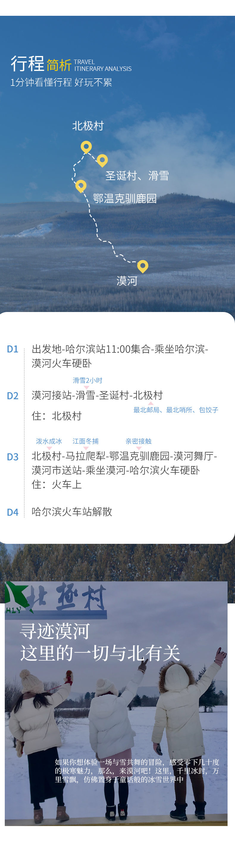 北极村(泼水成冰)-马拉爬犁(江面冬捕)-鄂温克驯鹿园(亲密接触)-漠河舞厅-漠河市送站-乘坐漠河-哈尔滨火车硬卧