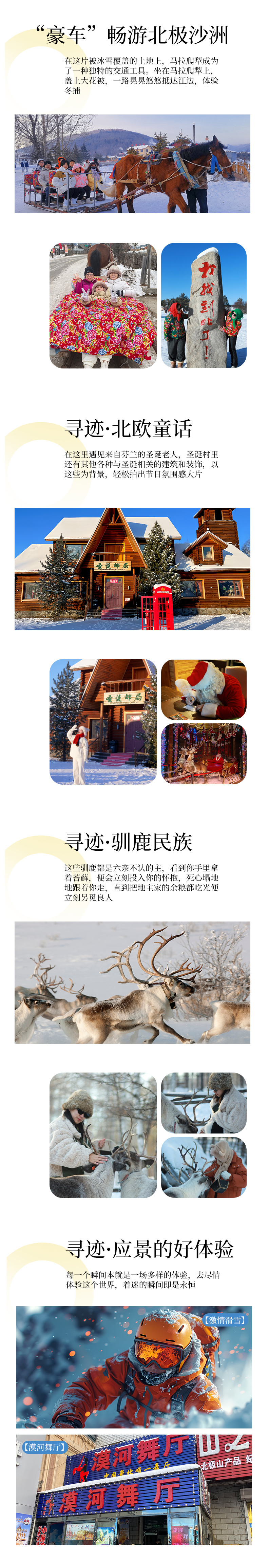 4、门票:圣诞村门票、北极村门票、鄂温克驯鹿园门票、漠河舞厅门票;