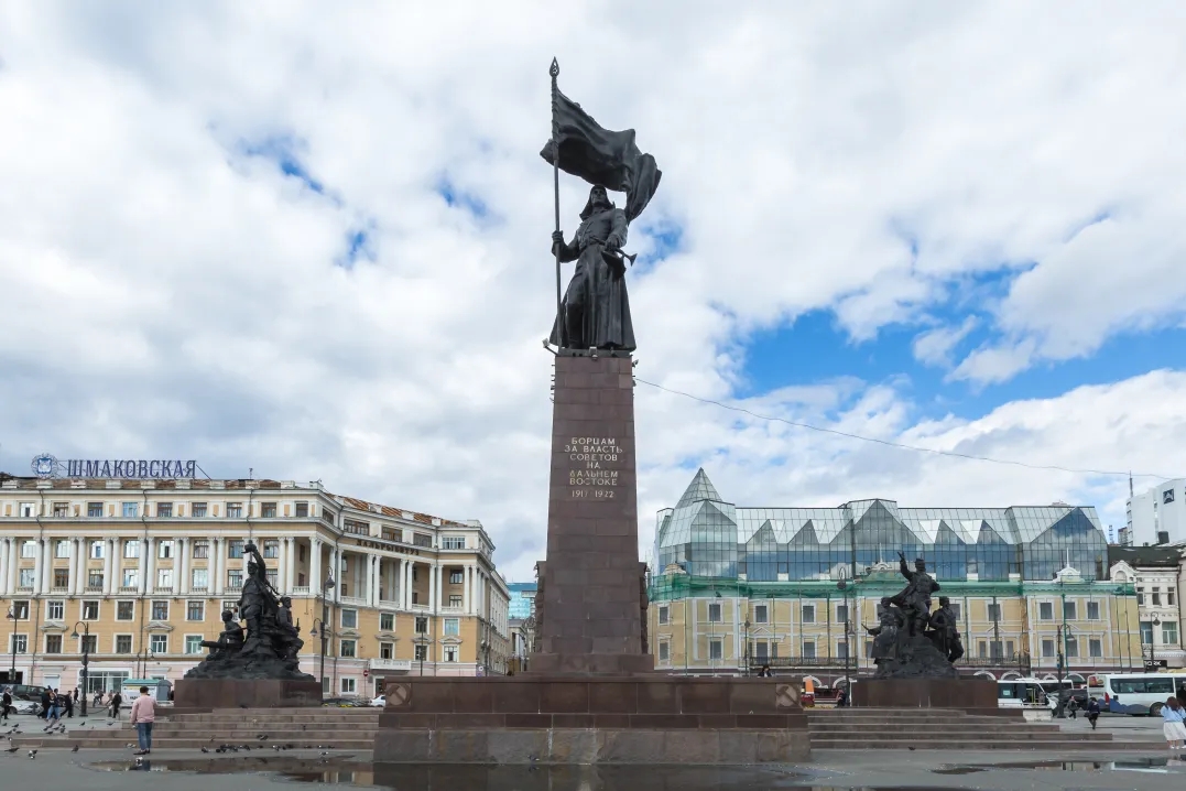10:00集合出发赴【胜利广场】远东苏维埃政权战士纪念碑。纪念1917年2月革命和7月革命中的英勇战士。正面面向金角湾,象征着防御海上来袭的敌人。