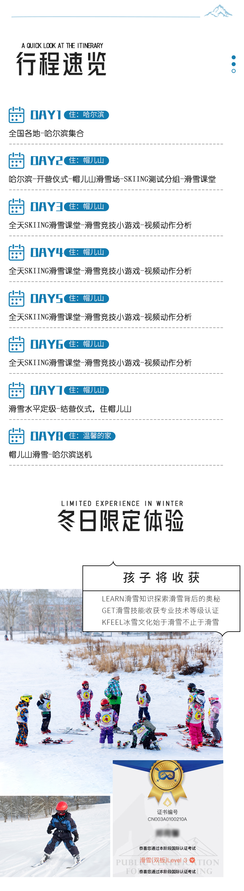 8:30-15:30 | 滑雪进阶学习,专业教练指导 | 专业教练进行课程1对4教学: | |