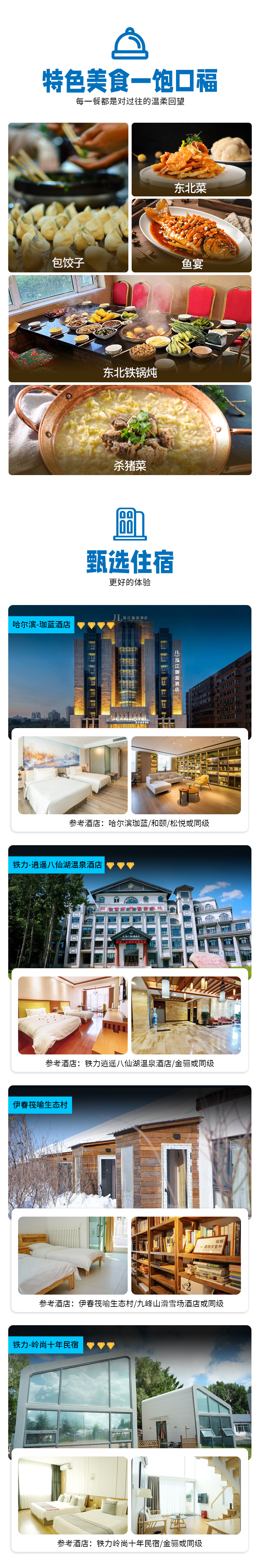 2、 用餐:包含5顿早餐,8顿正餐(东北菜+鱼宴+铁锅炖+雪地火锅+荒野厨房+包饺子)