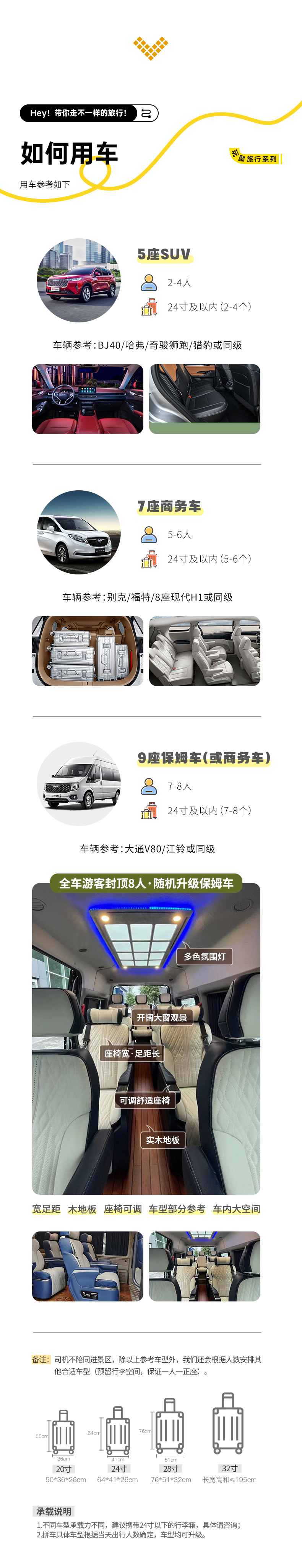 备注:车型承载力有限,携带行李为24寸或以下行李箱。