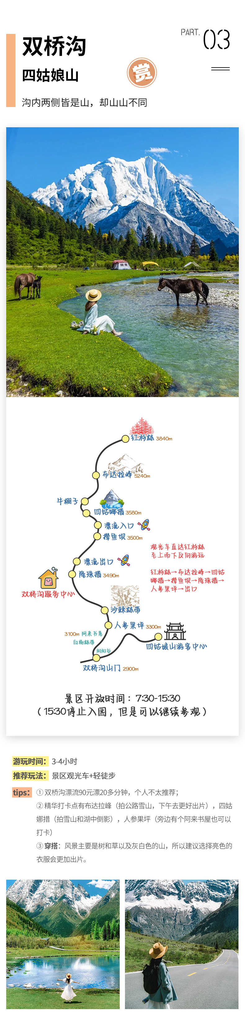 注:因双桥沟有限流要求,特殊情况下门票紧张,我们将更换安排海子沟和长坪沟的门票,以上两个景点也同属四姑娘山。