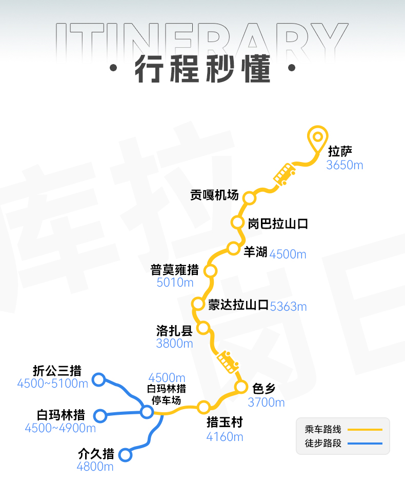 1.全程徒步约18公里,徒步平均海拔为4700米左右,徒步最高海拔为折公措垭口5000米左右,坐车最高海拔为蒙达拉山口5363米,住宿最高海拔为洛扎4000米左右。2.一月属于冬季,天气稳定,偶尔下雪,是看日照金山和星空最佳的时候,同时沿途的湖泊会结冰,也是看蓝冰的时候。