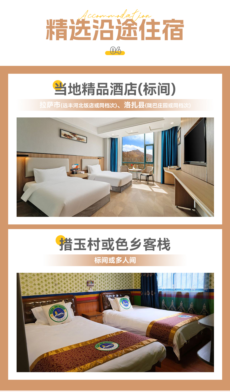 ①拉萨精品酒店1晚②洛扎县精品酒店2晚③两晚色乡/措玉村当地标间或多人间民宿。