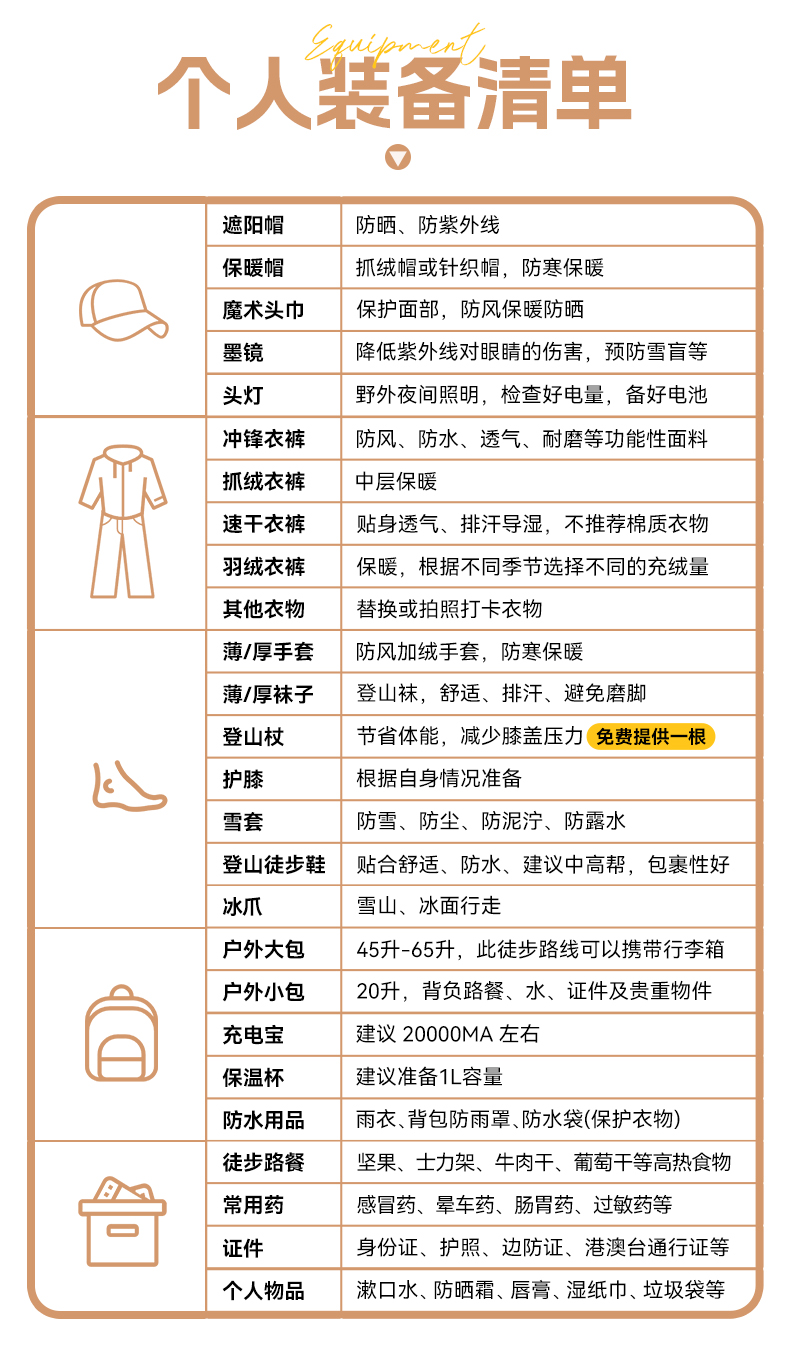 6、其他:旅行中的个人消费(部分早餐、个人其他消费等)全程不含午餐、晚餐,提前准备3-4天徒步中午的路餐,建议准备易携带、热量较高的食物:巧克力、士力架、面包、坚果、牛肉干、水果等。