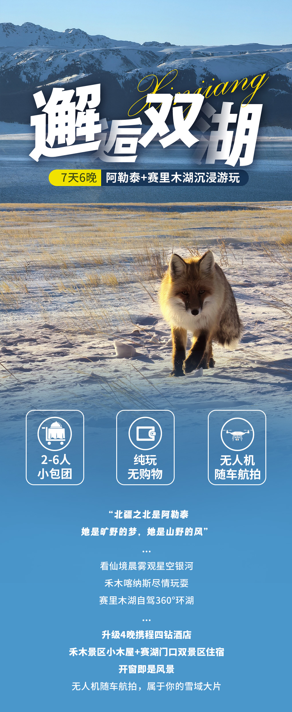 【景点门票】行程中所列景点首道大门票:喀纳斯、禾木冬季联票,赛里木湖冬季自驾票(冬季联票无其他优惠),