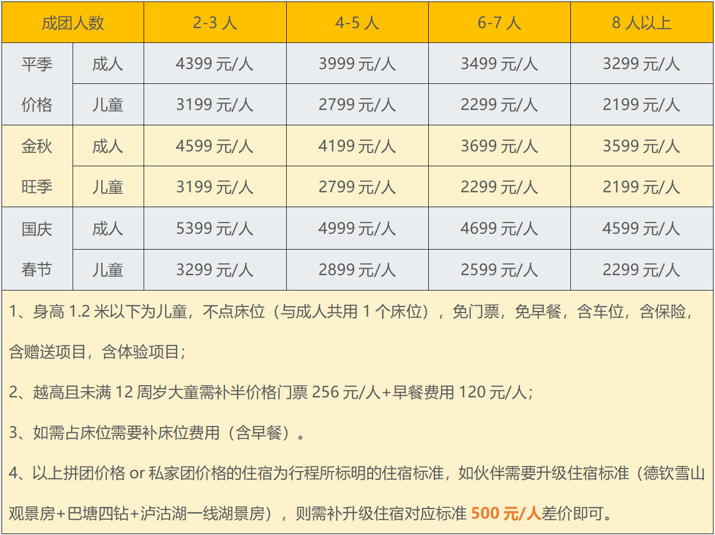 ▷房差:自然拼房2-3人标准间,如不愿拼房或拼不了房者须补单房差(平季900元/人,金秋旺季1100元/人,国庆1800元/人);