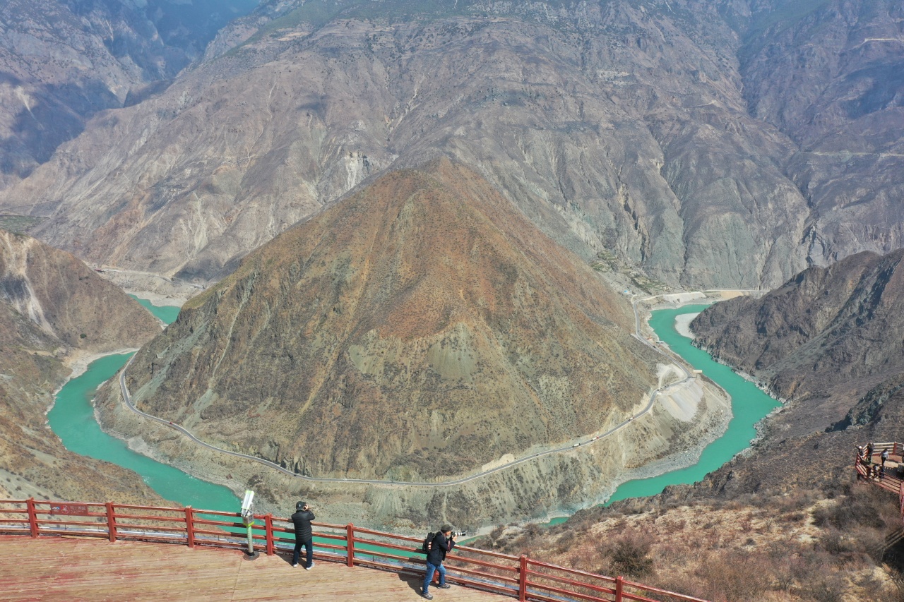 古城自由午餐后约一小时抵达万里长江第一湾观景台拍照留念抵达金沙江月亮湾,金沙江遭遇了一座浑圆的金字塔型山峰,金色的江水于是绕着山峰流出了一个标准的“倒Ω”形,这就是很多摄影作品中的金沙江大拐弯;游览完月亮湾后进入白茫雪山腹地,穿越隧道经德钦县城约傍晚抵达飞来寺。