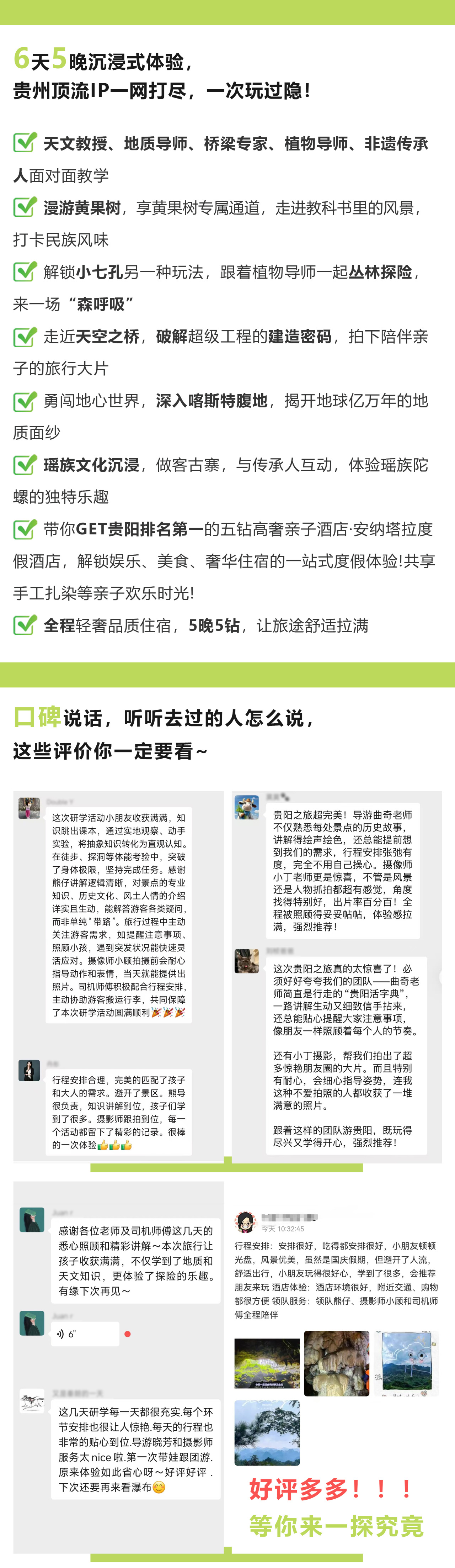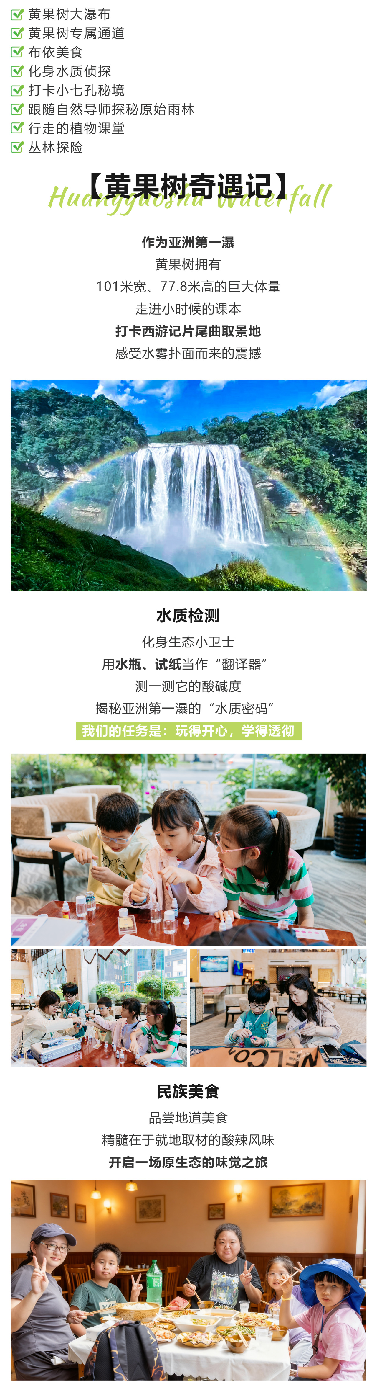 上午:乘车前往国家5A级景区黄果树瀑布,途中聆听导游讲解喀斯特地貌奇观。走进课本里的黄果树,漫步林间步道,水雾扑面,轰鸣入耳,壮阔的主瀑如银河倾泻,激起漫天彩虹。孩子们在安全区域观察水流走向,收集水质,化身侦探,记录自然奥秘。