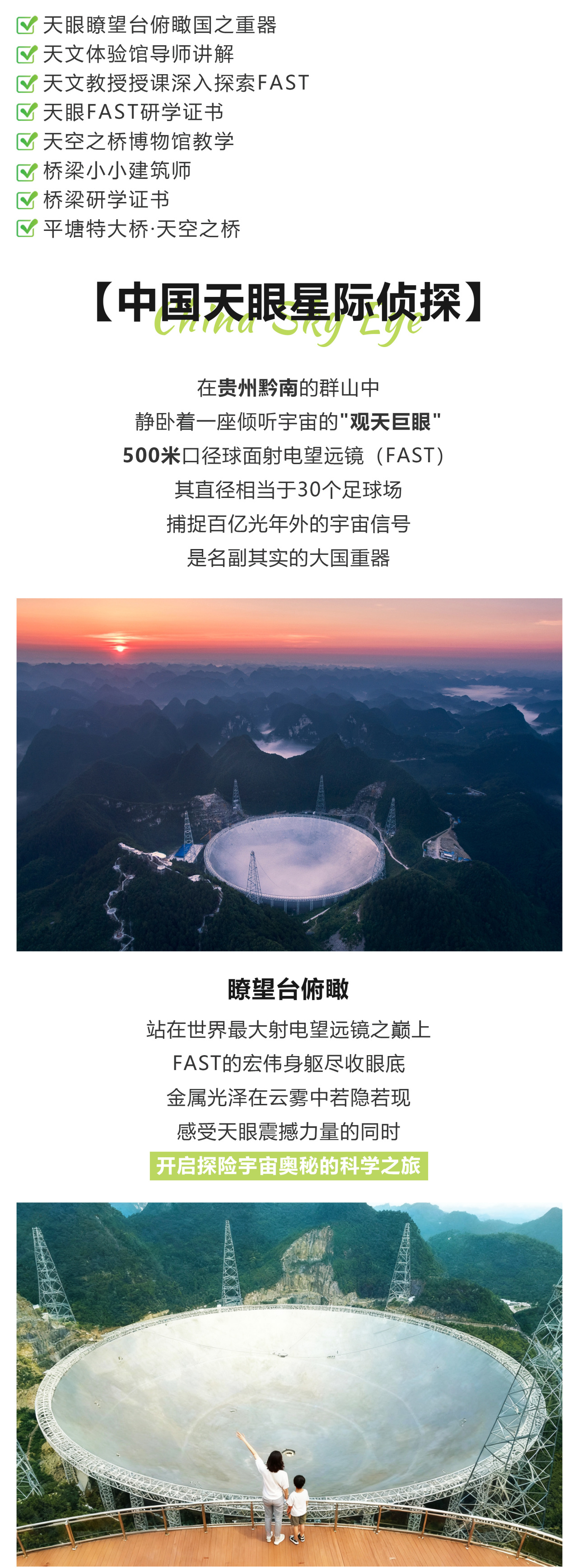 下午:随后前往“中国天眼”在专业讲解员的带领下探秘天文体验馆,通过沉浸式影像了解FAST的建造历程与科学使命,然后登上观景平台,俯瞰世界第一大单口径射电望远镜的壮丽全貌,500米直径的银色“天锅”静卧群山之间。孩子们屏息凝神,聆听来自宇宙深处的脉冲信号模拟音。