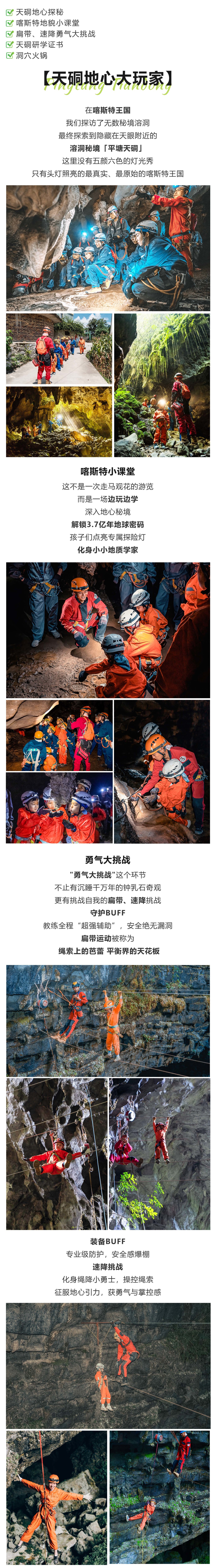 上午:乘车前往天硐山体公园,穿戴装备,了解探洞注意事项,出发探洞,体验天硐游玩项目,黑暗冥想,喀斯特小课堂,游玩后享用特色午餐,洞穴火锅,用餐后自由参加扁带速降。