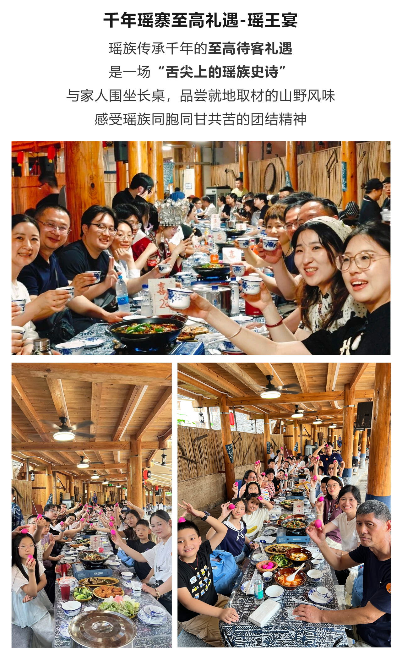 夜幕降临,入座瑶王宴的长桌旁,火塘映红了每一张纯真的笑脸。篝火燃起,瑶族阿哥阿妹踏着鼓点起舞,孩子们围火而坐,学唱古老歌谣,声音融进山谷夜风。星河垂野,一场关于勇气与自然的传说在火光中娓娓道来,童心与文化在此刻悄然共鸣。