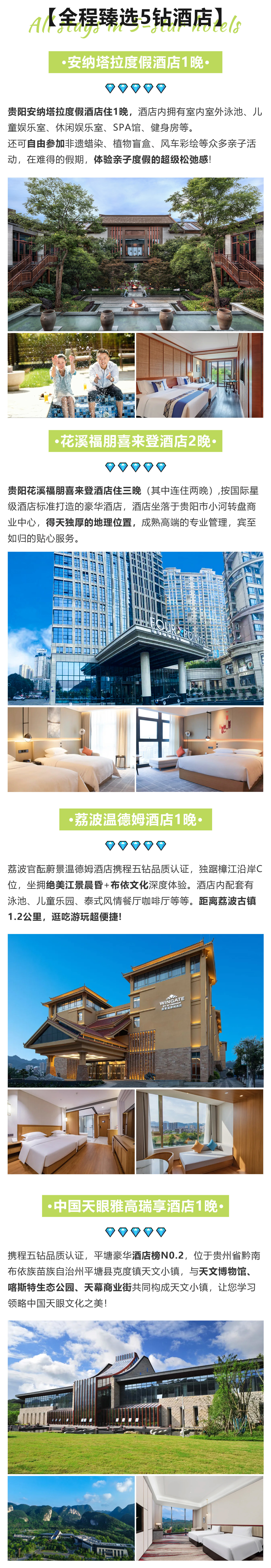 【住宿】:全程五钻酒店住宿,贵阳安纳塔拉1晚;花溪福朋喜来登2晚;荔波温德姆1晚;天眼雅高瑞享酒店1晚;