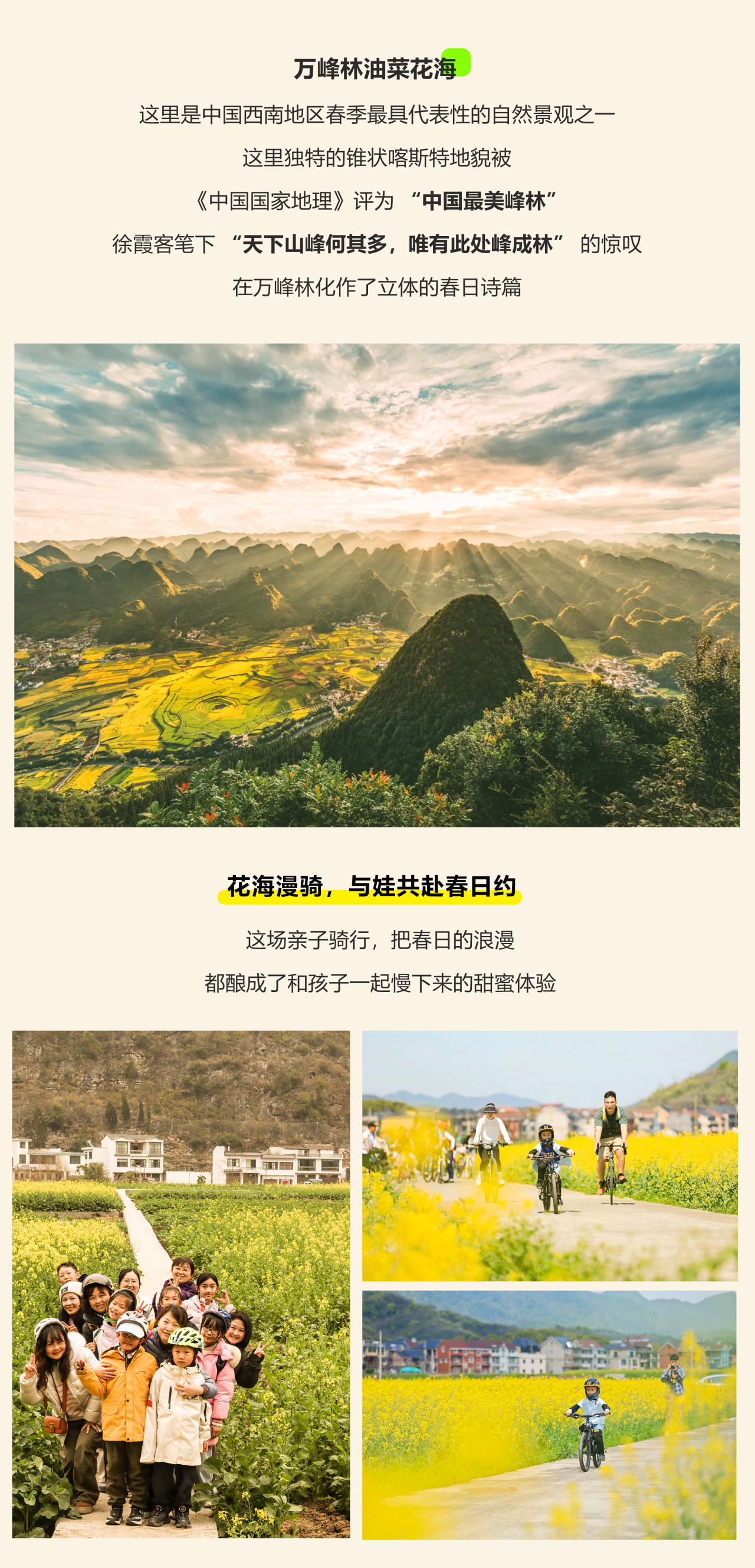 下午乘车前往布依寨,【骑行穿越花海】,寻觅“中国第一抹春色”,万亩油菜花海能实现你想象中的田园生活。站在田野间,看着金灿灿的油菜花海,各种形态的山峰,蓝天白云的映衬,简直就是一幅浪漫的油画。穿行在布依村寨,大口呼吸着带有花香的空气。