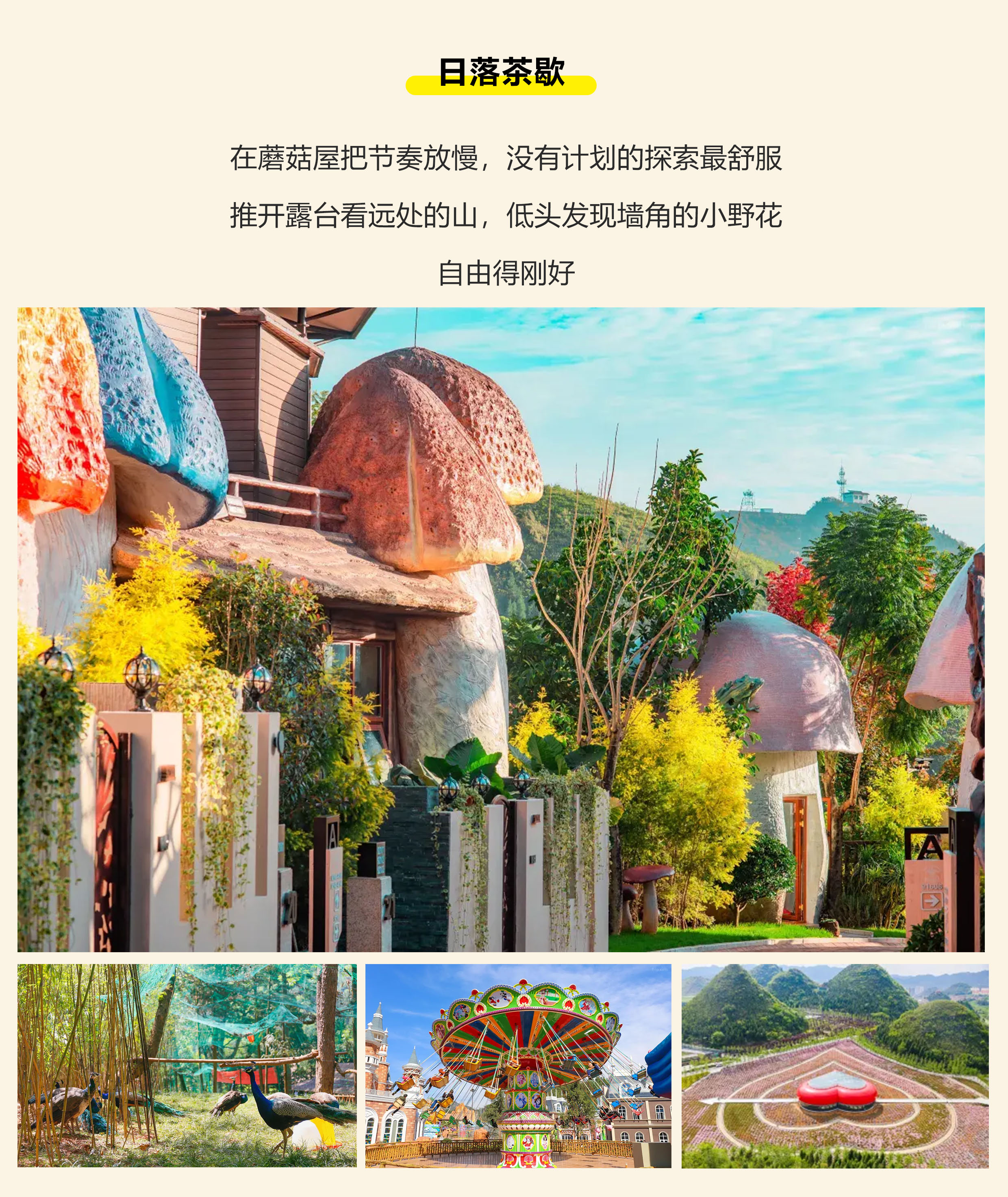 下午我们将自由探索蘑菇屋,看错落的“蘑菇”建筑缀着藤蔓阳光,阳光透过蘑菇状穹顶洒下。在酒店观景台,能远眺山峦云雾。靠着窗边,茶香袅袅,闲坐间听鸟鸣风吟,每一步都藏着自然与惬意的惊喜。