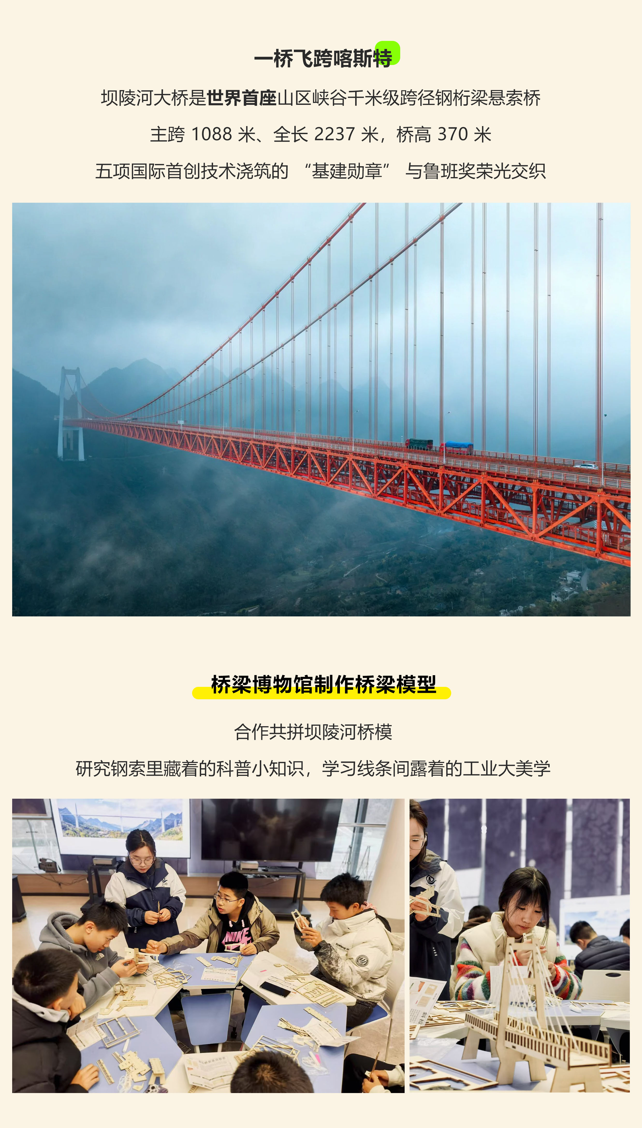 早餐后乘车前往【坝陵河大桥】,走进坝陵河桥梁博物馆,仿佛进入一座充满未来感的桥梁宇宙。展示的每一项技术突破都诉说着人类征服自然的智慧。在桥梁工程老师的带领下,挑战动手搭建桥梁模型。不仅可以锻炼动手能力,还能学习到桥梁设计和建设的复杂性。每一个部件的安装、每一处结构的调整,都需要精心思考和反复尝试,让大家更真切的感知【大国重器】。