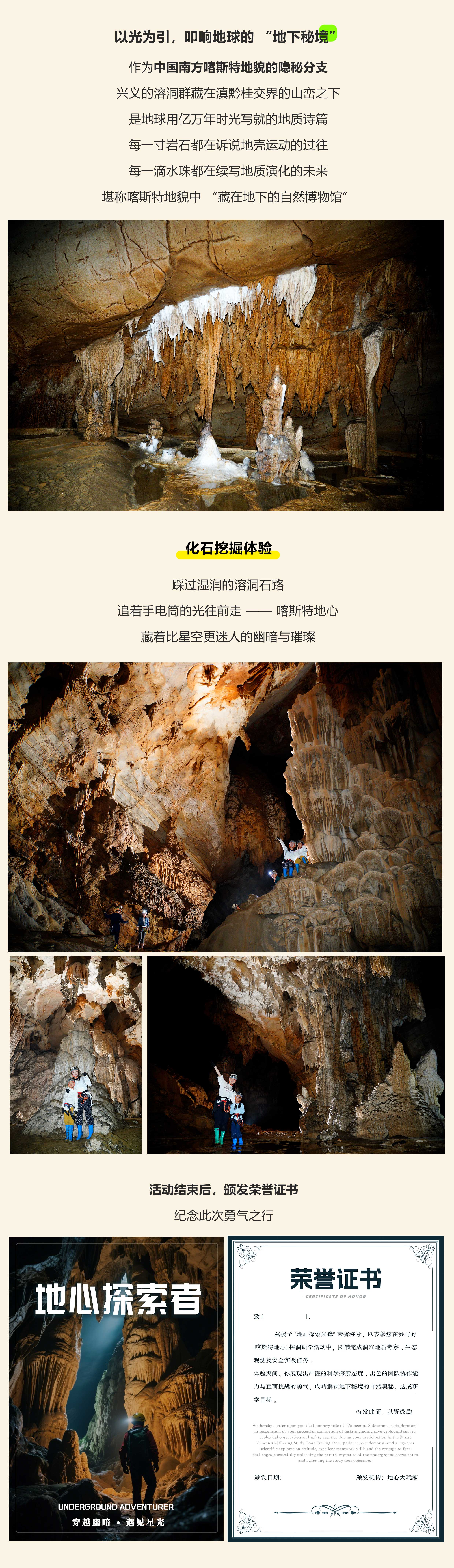 早餐后乘车前往【地心入口】在教练团队的指导和带领下,穿戴好装备,深入地心穿越洞口峡谷,身旁是历经亿年形成的岩壁和形态各异的钟乳石,深入溶洞腹地,感受从黑暗到微光的奇妙变化,一步步解锁地心深处。在溶洞深处的静谧角落,隔绝了外界所有的喧嚣,只有滴答的滴水声如同自然的节拍,伴着这独特的韵律进行冥想,让身心在大自然的怀抱中得到彻底放松,找回内心的平静。