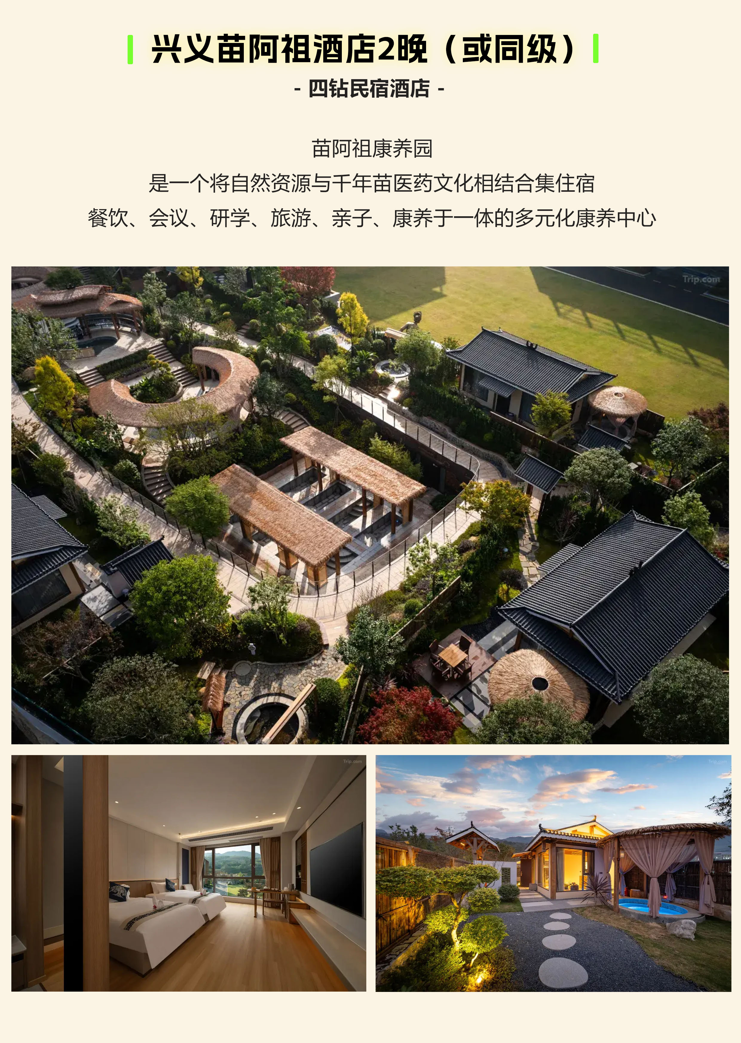 【住宿】全程优选携程4钻及以上酒店(参考酒店:贵阳水投上善酒店1晚,兴义蘑菇野奢酒店1晚,兴义苗阿祖酒店2晚,黄果树漫格兰酒店1晚,无房更换为同级)