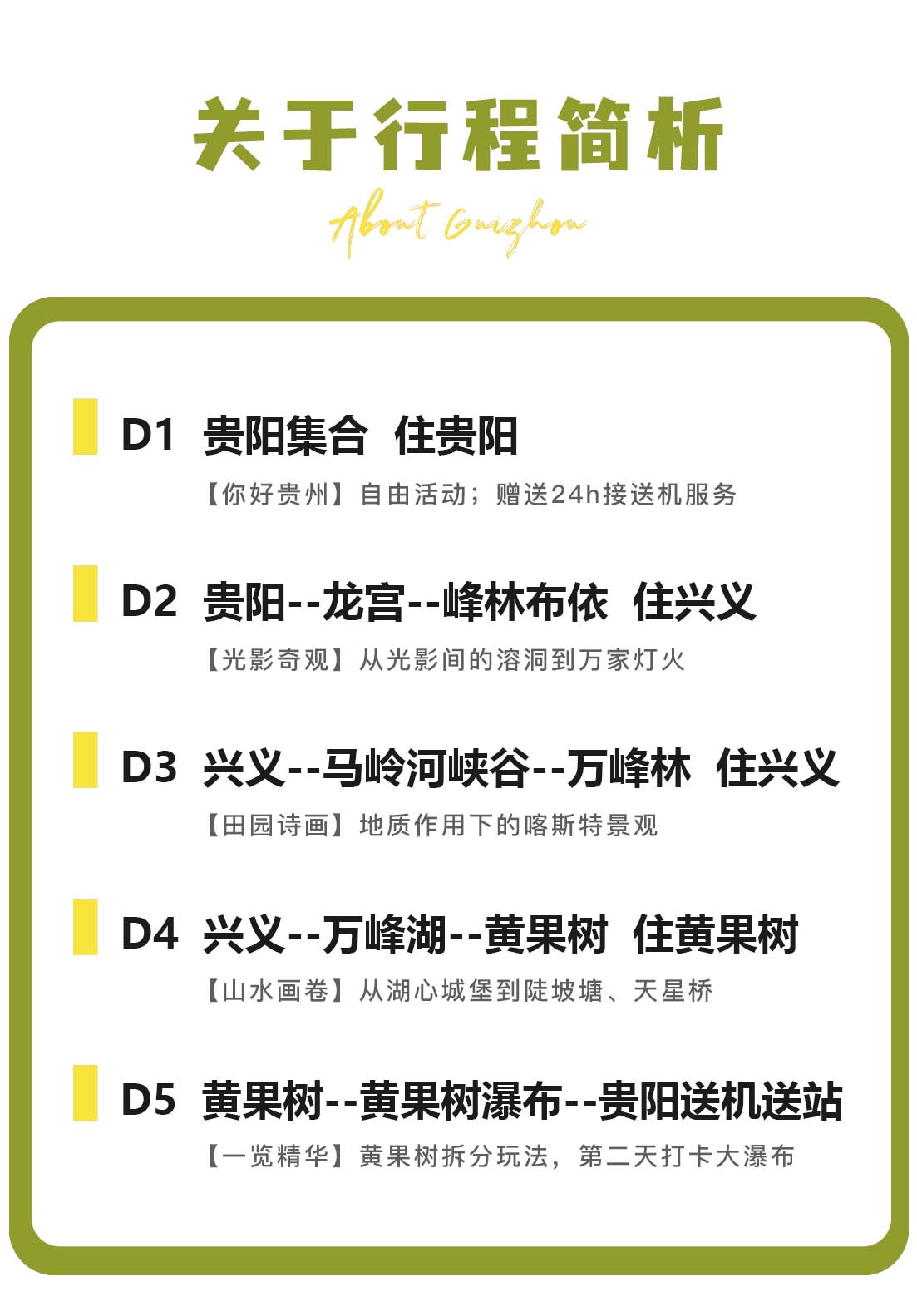 2. 集合日赠送24小时接机接站服务(接站点为贵阳北站、贵阳东站、贵阳机场),集合日无行程用车。解散日赠送统一送站服务(默认先送贵阳机场再送贵阳北站,根据实际情况酌情调整,其他站点返程需要自行散团)