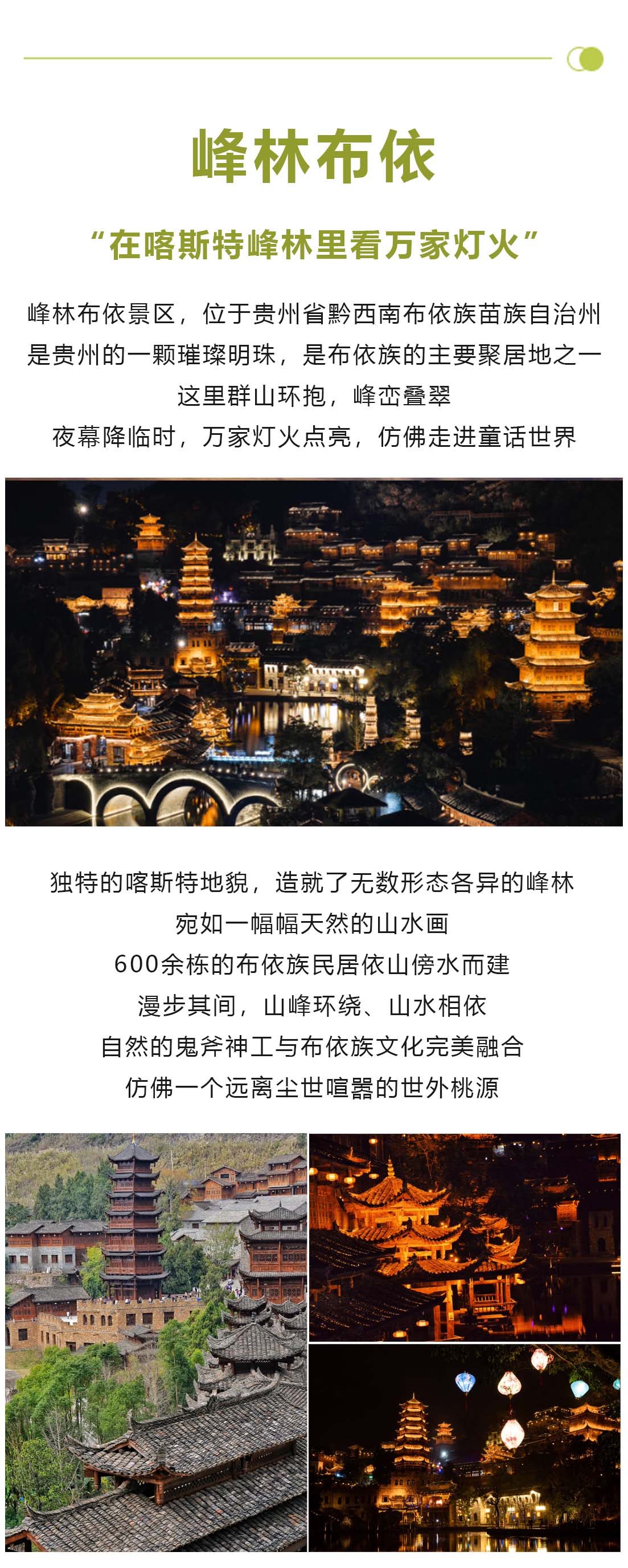 下午乘车前往【峰林布依】,走进峰林布依景区,犹如走入一幅布依族生活长诗。勒尤湖和浪哨湖两岸依山而建的布依族建筑,古朴自然。对歌长廊上,阿哥阿妹隔人海对唱《浪哨》,婉转歌声,诉尽布依儿女绵绵情意;台上,形式活泼、风格质朴的布依戏唱响,古老的布依族故事荡漾在街区;沿街店铺里,镌刻着花鸟鱼虫、草木藤蔓的刺绣服饰,工艺精湛的布依三维草编,有布依特色的布偶、耳饰等,令人应接不暇。