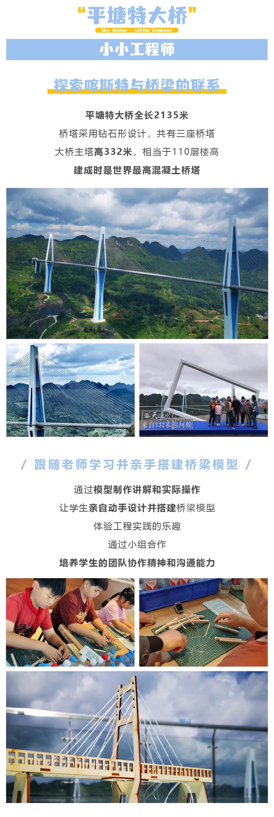 “世界桥梁看中国,中国桥梁看贵州”,贵州桥梁几乎包揽了当今世界上的全部桥型,一座座的大桥像是一把把打开大山禁锢的钥匙,也更是孩子们了解桥梁工程科技和研学大国重器的重要课程载体。为此,我们安排了特色活动【搭建桥梁模型】课程,小朋友们将化身小小工程师,通过一系列生动有趣的学习和实践环节,深入了解桥梁的奥秘。这是一次从书本走向生活,从课堂走向社会的研学活动,通过了解桥梁科技的伟大成就,激励小朋友们投身科技创新,树立成为大国工匠的远大目标,增强对于“中国力量”的自豪感。
