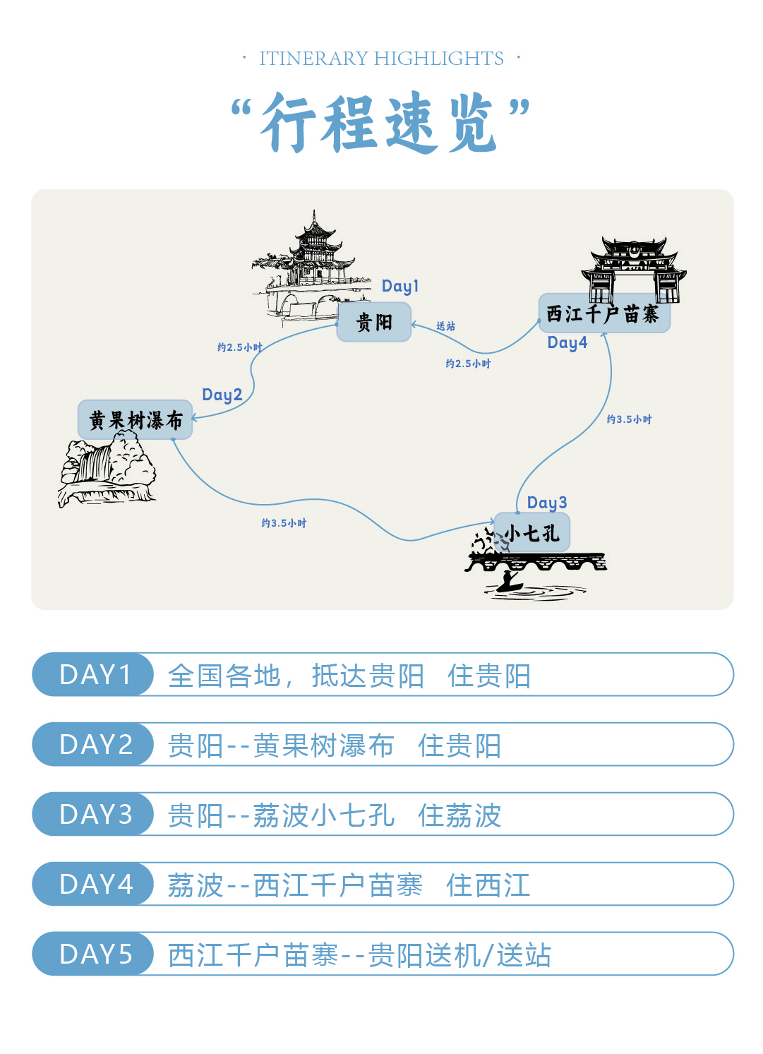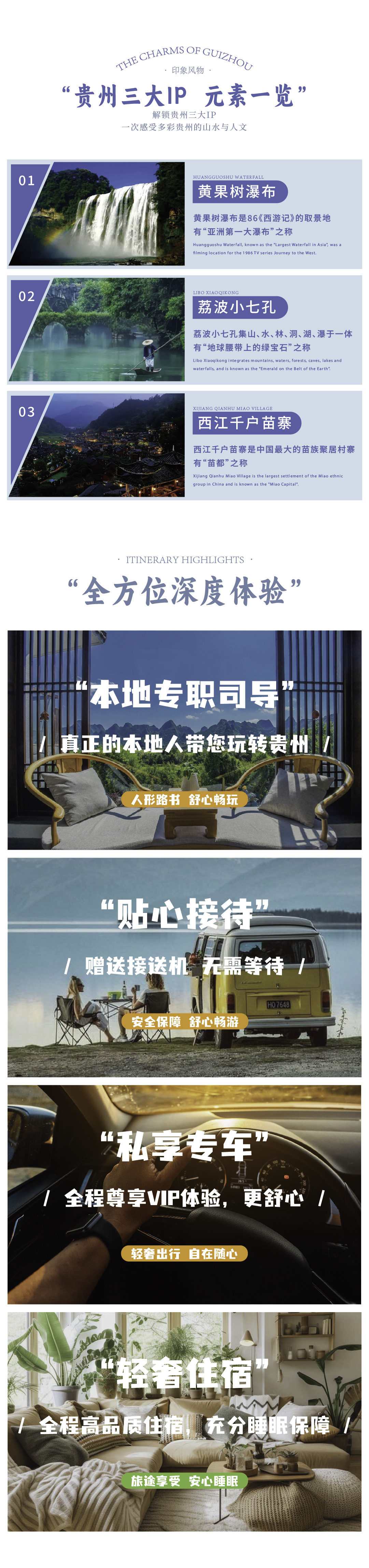 2. 集合日赠送1次接送站服务,解散日根据返程班次安排统一送机送站服务(仅送贵阳机场及贵阳北站)。