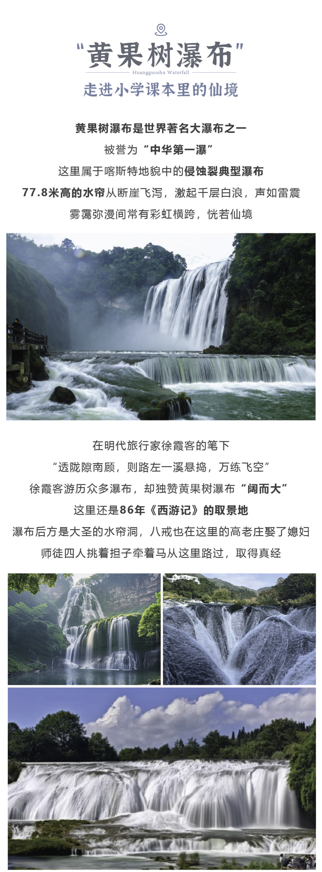 早餐后,乘车前往【黄果树】,黄果树分为【陡坡塘】、【天星桥】、【黄果树大瀑布】三个景点,景区内以【黄果树大瀑布】(高77.8米,宽101.0米)为中心,分布着雄、奇、险、秀风格各异的大小18个瀑布,形成一个庞大的瀑布“家族”,被大世界基尼斯总部评为世界上最大的瀑布群,【陡坡塘瀑布】这里也是唐僧师徒四人取经的必经之地,陡坡塘瀑布还有一个特殊的现象:每当洪水到来之前,瀑布都要发出“轰隆、轰隆”的吼声,因此又叫“吼瀑”。