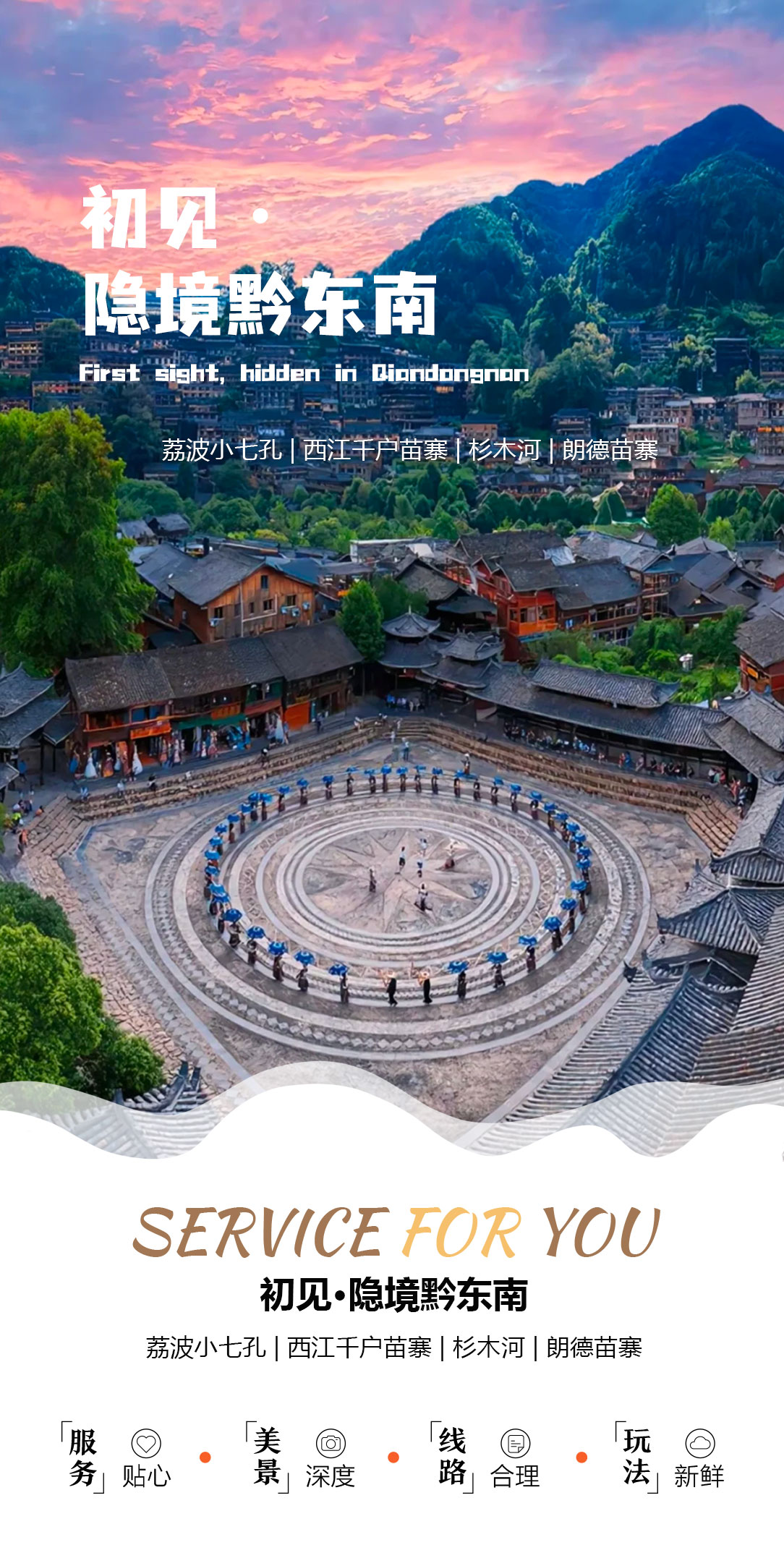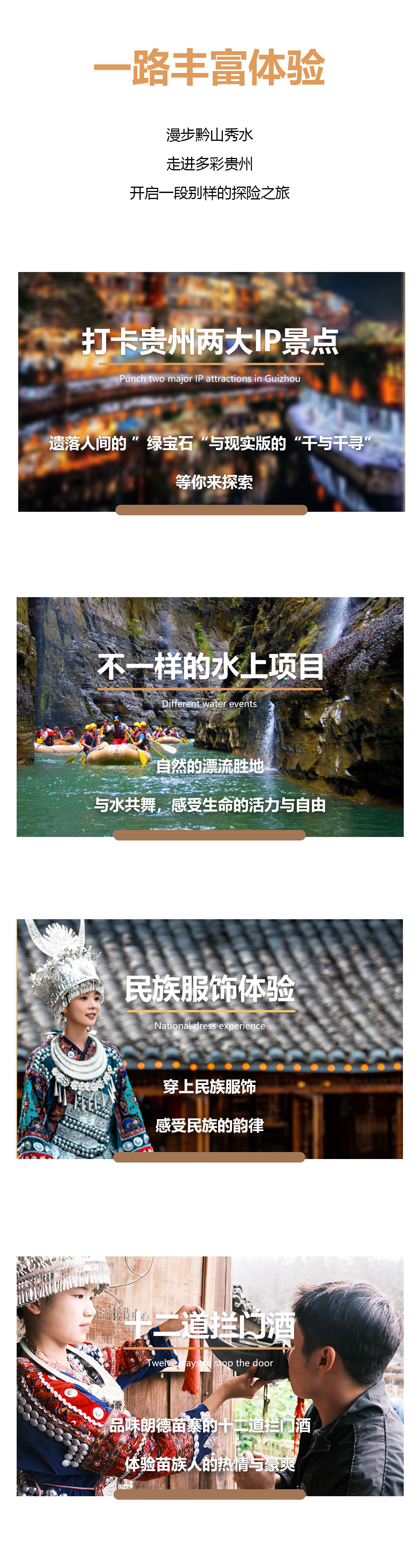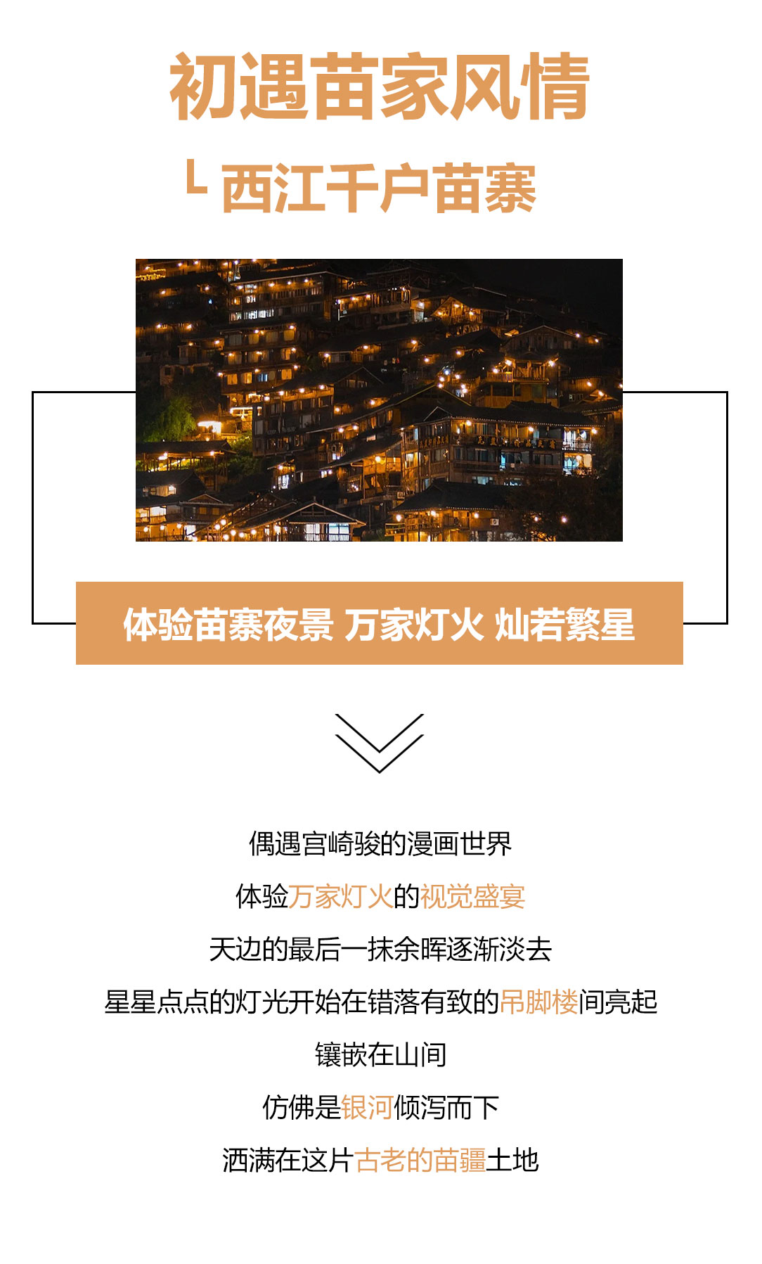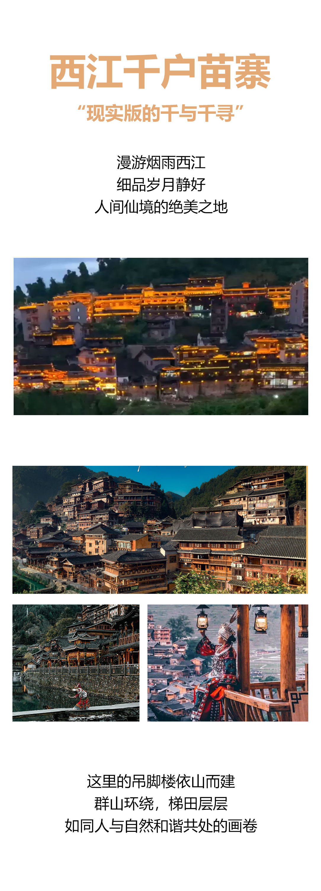 早餐后 从荔波出发去【西江千户苗寨】,位于贵州省黔东南苗族侗族自治州雷山县西江镇南贵村,距雷山县城36千米,距黔东南州州府33千米,由十余个依山而建的自然村寨相连成片,四面环山,重连叠嶂,梯田依山顺势直连云天,白水河穿寨而过,将西江苗寨一分为二。西江千户苗寨在半山建造独具特色的木结构吊脚楼,千余户吊脚楼随着地形的起伏变化,层峦叠嶂。西江千户苗寨主要景点有西江苗族博物馆、鼓蔵头家、活路头家、酿酒坊、刺绣坊、蜡染坊、银饰坊、观景台、噶歌古道、田园观光区等。每当夜幕降临,吊脚楼和风雨桥上的灯光,如同繁星般点缀在一瓶静谧的大地上,与河流相映成趣,构成一幅绝美画面。赠送西江苗服穿着体验,感受苗族文化的独特魅力。