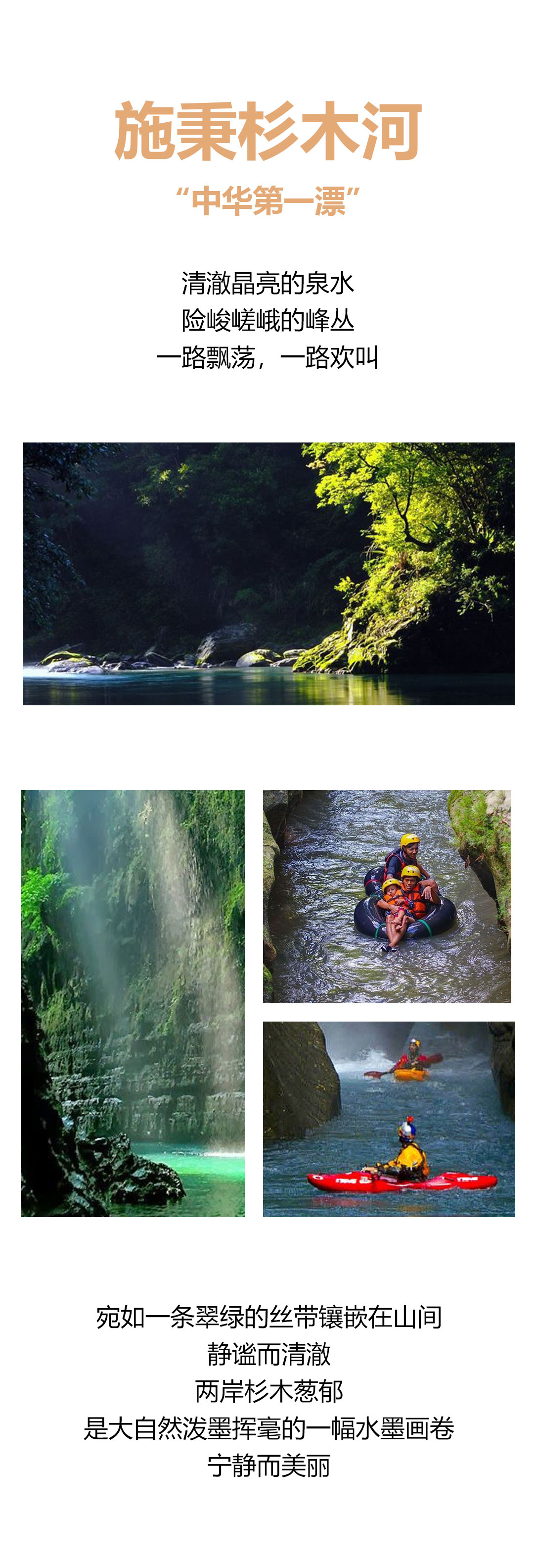 早餐后我们前往【杉木河景区】,景区以清澈晶亮的泉水,险峻嵯峨的峰丛为主体,具有“雄、秀、幽、奇”自然特色。步入景区,单见山羡水俏丽,水峦山环淌,整个景区幽而不闭、深而不险;河床白砂铺垫,砂丘一尘不染;水中鳌蟹结队,鱼虾自由遨游;两岸悬壁藤蔓,古树临空舒展,千年古峡一派生机盎然。这里最有名的就是杉木河的漂流。杉木漂流回归自然,妙趣横生有惊无险,在44公里的流程内落差高达640米,是贵州东线兴起绿色生态旅游的热点,也是中国国内最好的漂流场所地点之一。虽然河水落差较大,但是水深大部分只及大腿,在这里即使落水也没有太大的危险,因此整个漂流有惊无险,非常适合橡皮艇漂流。漂流起点有两岔河、蒋家田两处。两岸景色不错,可以一边漂流的刺激,一边享受美丽的风光。在杉木河体验矿泉水漂流,欣赏美丽的山水风光和多样的自然景观。