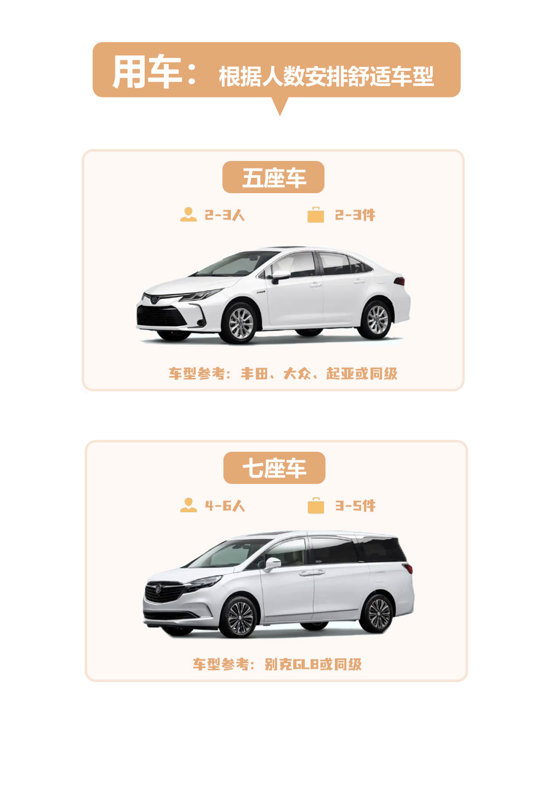 【交通】根据人数安排车辆(2-3人5座车,4-6人7座车,7-8人9座车)