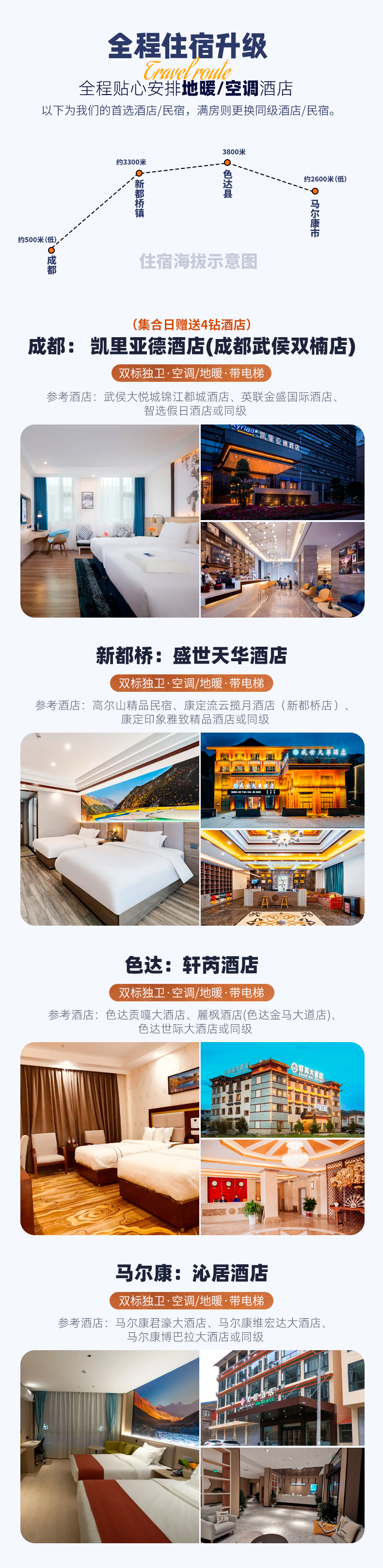 2、住宿:全程4晚地暖/空调标间住宿(含集合日赠送1晚4钻酒店、不住不退);