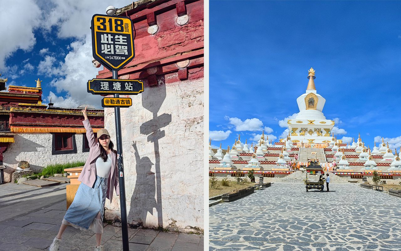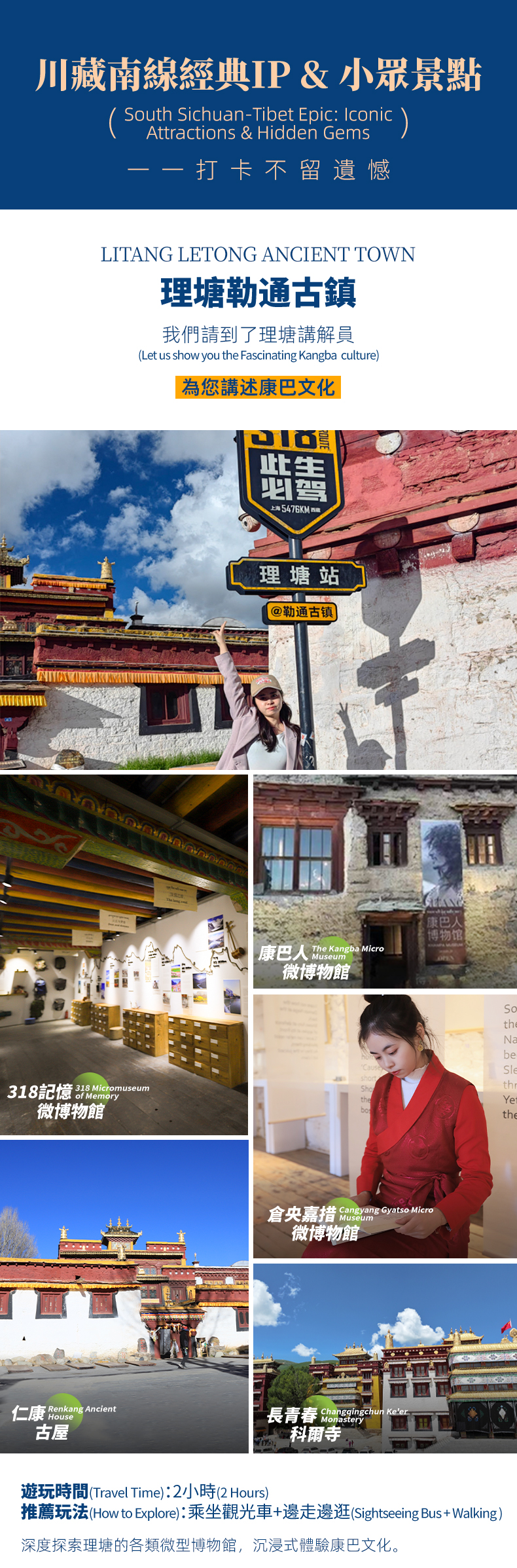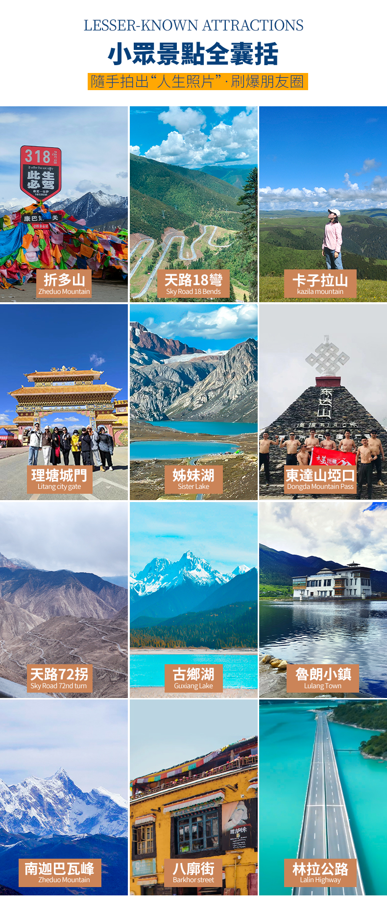 【行程概述】早餐後乘車離開雅江,沿途觀賞【天路十八彎】的險峻,穿越【剪子彎隧道】,隨後翻越【卡子拉山】(埡口海拔4718米),抵達【丁真的家鄉】--理塘,這裏風景絕美,六世達賴喇嘛倉央嘉措曾在詩裏寫下自己對理塘的嚮往:“潔白的仙鶴啊,請把你的翅膀借給我,我不會飛到很遠的地方,我到理塘轉轉就回......‘’我們將在理塘遊覽《丁真的世界》宣傳片裏出現的【勒通古鎮·千戶藏寨】,這是全世界規模最大的傳統藏寨群落,有超過4000棟的傳統藏房,是探尋藏文化和康巴風情的不二之選。在這裏,我們可以隨著景區講解員的講解依次遊覽:【318記憶微博物館】、【康巴人微博物館】、【仁康古屋(先後降生過十三位德高望重的大活佛)】、【倉央嘉措微博物館】,幸運的小夥伴還可以偶遇丁真。隨後參觀康區歷史最悠久、規模最大的藏傳佛教黃教寺廟--【長青春科爾寺】,聆聽它的傳奇故事。遊覽後繼續前行,經無量河,翻越形似兔子的【兔兒山】(埡口海拔4696米),途經青藏高原最大的古冰川遺址、稻城古冰帽——【海子山】自然保護區(海拔4500米),一邊聆聽著車內的音樂,一邊欣賞著【毛埡大草原】的風光,每年6-8月份,是最美麗的時節,一望無邊的草原上野花盛開,無數牛羊散落其間,邦錦美朵、格桑花以及各種不知名的小花璀璨盛開,就是一個花的世界。而後途徑海子山上的【姊妹湖】,兩處碧藍澄澈的的高原湖泊緊緊相依,在一呼一吸之間,散發著讓人沉醉的恬美,在荒涼山原上,如天堂寶石般鑲嵌其中,亦如神之悲憫化作眼淚滴落凡間,純淨無暇,盈盈可親。一路邊走邊玩,車子很快就到了四川的邊界巴塘。