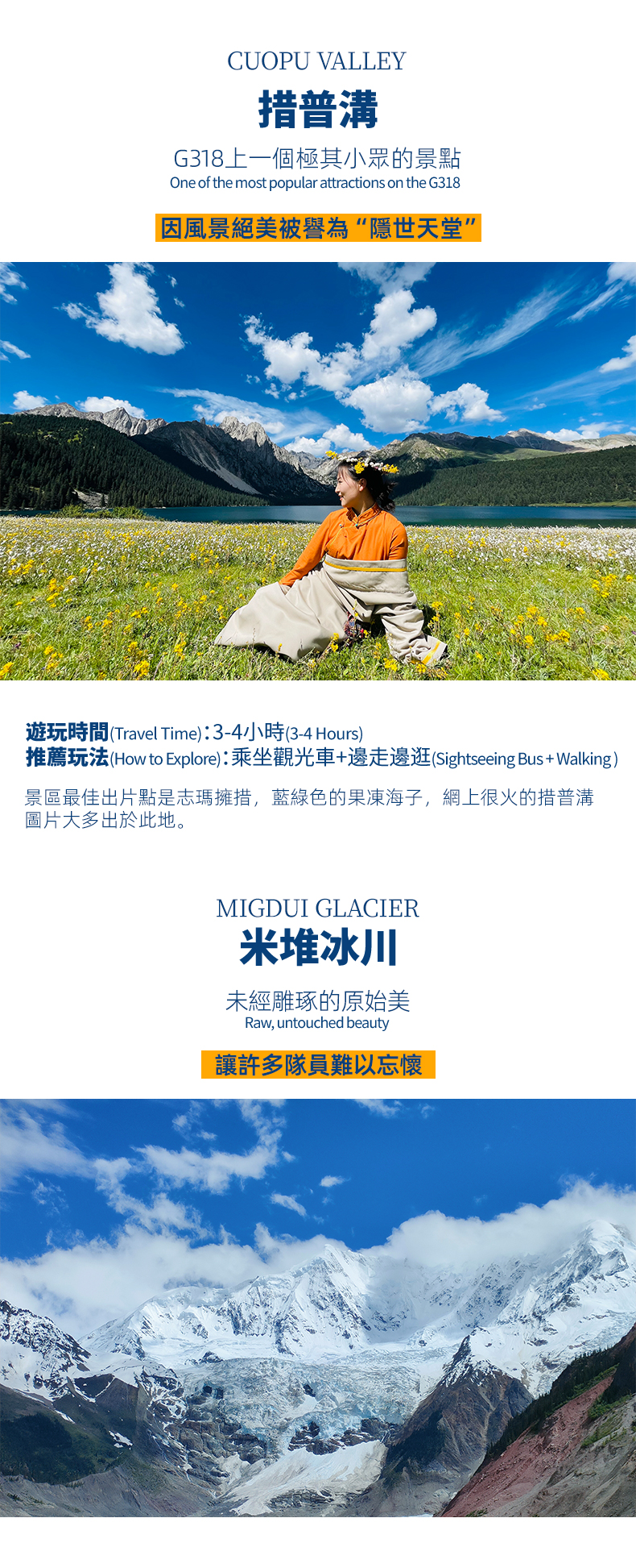 3、門票:勒通古鎮門票+觀光車、措普溝門票+觀光車、米堆冰川門票+觀光車、巴松措門票+觀光車、布達拉宮門票、大昭寺門票;