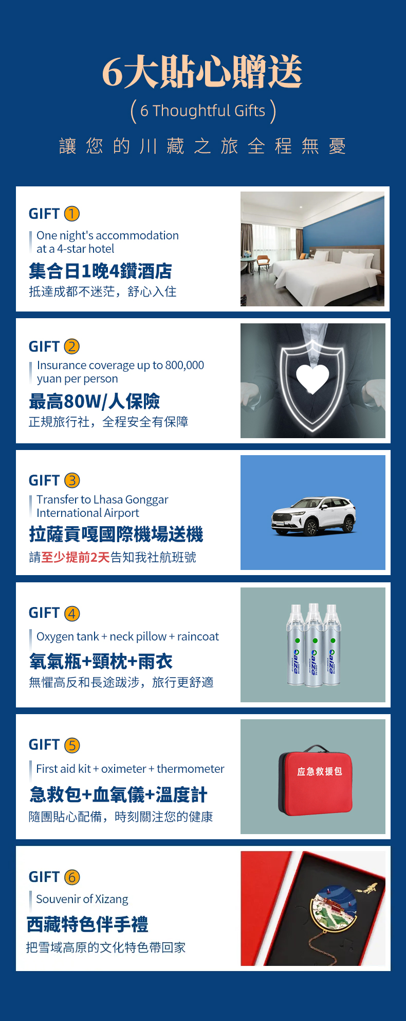 (1)經過前幾天的海拔適應,今天的行程將向高海拔地區前行,為避免高原反應,我社隨車備有可攜式氧氣以備急用;