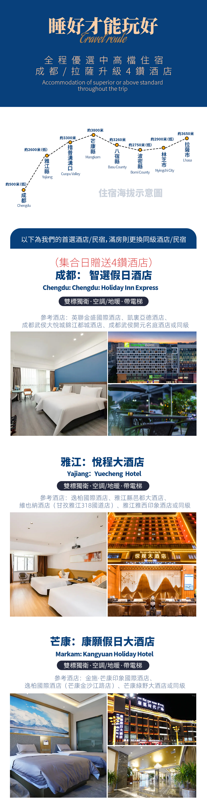 (2)到集合酒店報“大美G318+姓名”拿房,房費已付,押金自付。入住酒店的時間一般在集合日當天的14點以後,如果您提前到達且酒店房間未整理出來無法辦理入住,可將行李暫時寄存在前臺,先在市區周邊自由遊玩;