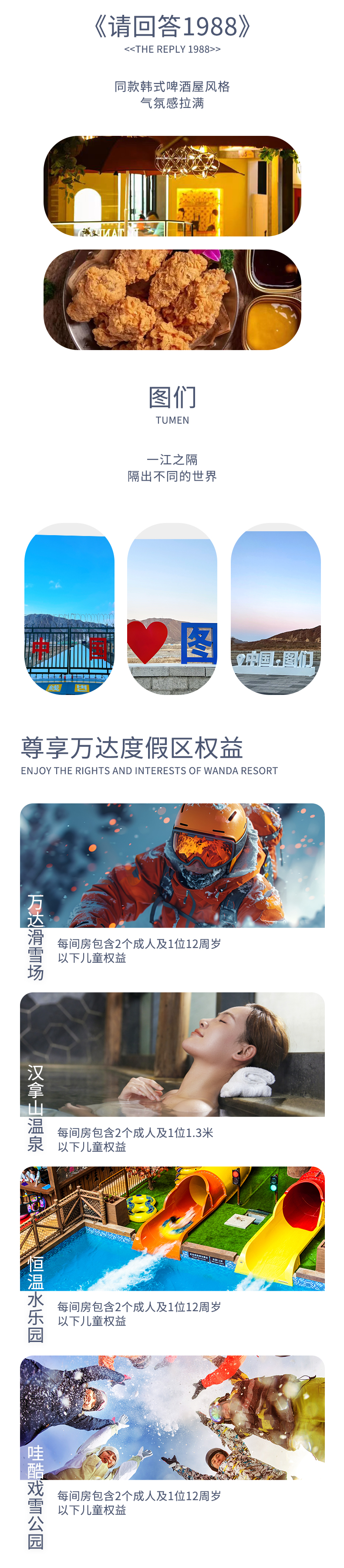 1.2米及以下为儿童,不含床位,不含门票、不含早餐、免温泉、含滑雪、含车位、含司导、含保险、含赠送,超高但未满12周岁需补半价门票362元+早餐费262元+温泉275元,如需占床补2900元床位费含早餐含3晚温泉 升级轻奢版补差价1600元/人 延吉参考卡伊洛斯/红菊或同级 二道白河参考王朝圣地或同级 长白山万达锦华度假/锦华套房或同级 延吉卡伊洛斯/红菊或同级 升级天花板补差价6700元/人 延吉参考卡伊洛斯/红菊或同级 二道白河参考皇冠假日/蓝景生态或同级 长白山万达凯悦/威斯汀/喜来登或同级 延吉卡伊洛斯/红菊或同级 备注:赠送项目中万达度假区滑雪场、水乐园、戏雪公园(每间房包含2个成人及1位12周岁以下儿童权益)汉拿山温泉(每间房包含2个成人及1位1.3米以下儿童权益)儿童超出人数费用自理。 升级酒店差价、升级后儿童早餐费用和温泉费用,以客服回复为准 | ||||
