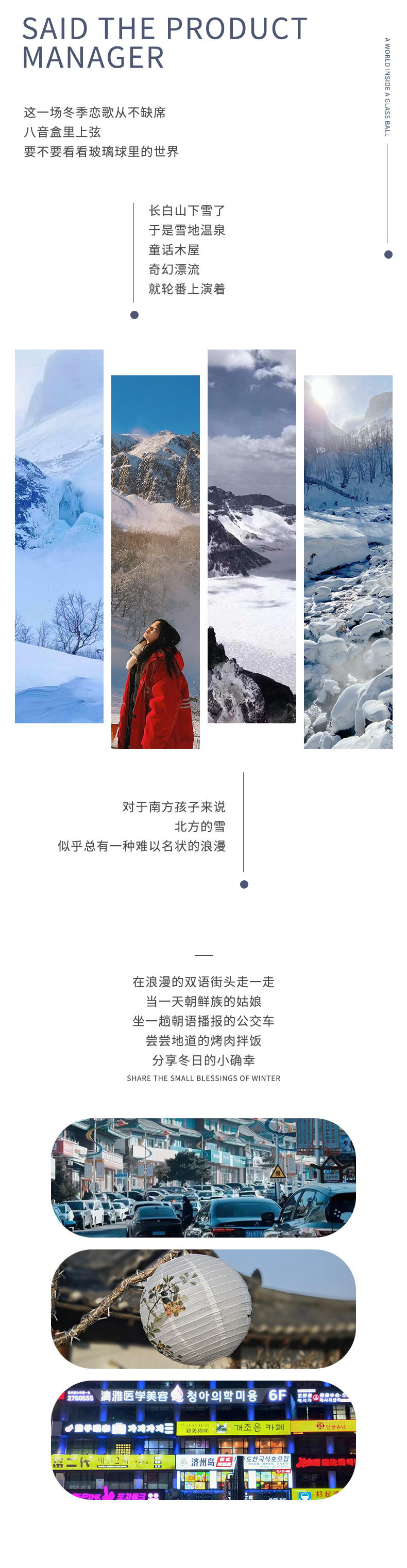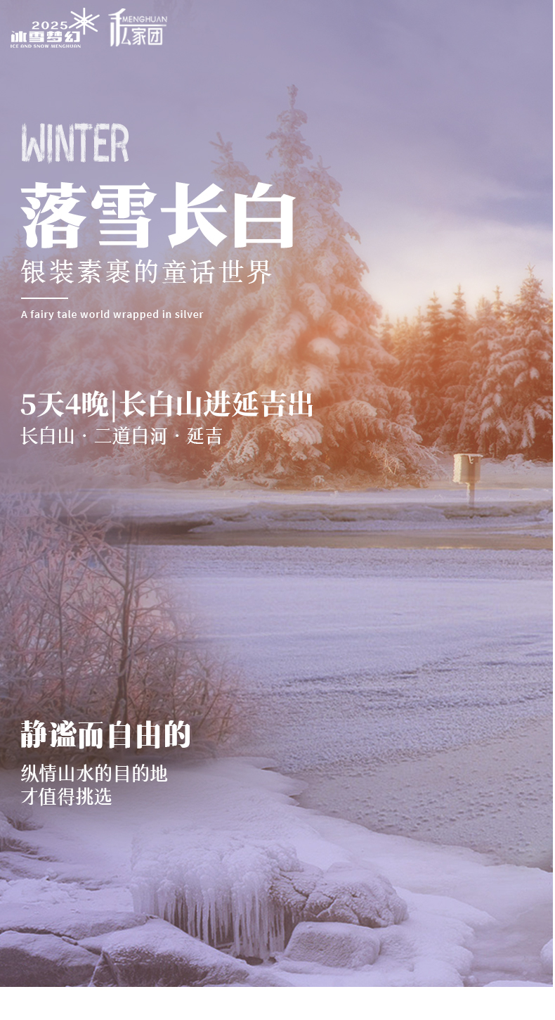 二道白河-雪地漂流-雪岭漫步(62KM,车程约1.5小时)-马拉爬犁-雪地摩托-网红驯鹿-延吉网红弹幕墙-《人生一串》(120KM,车程约2.5小时)