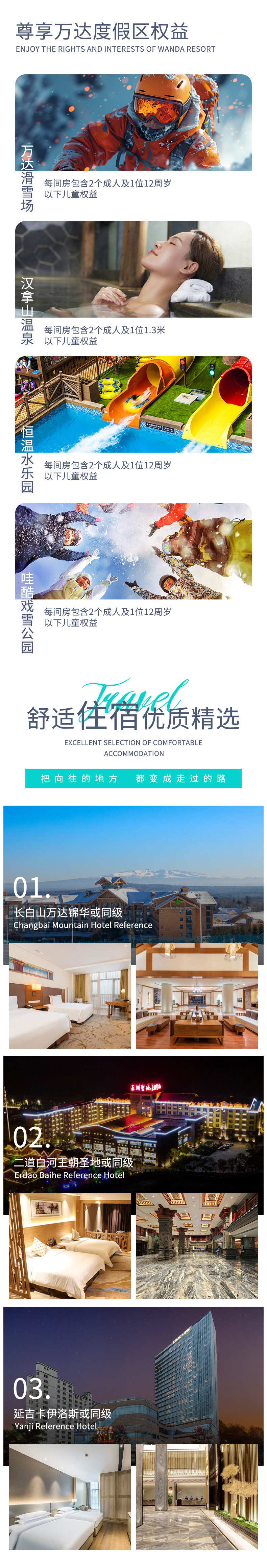 1.2米以下为儿童,含车位费、赠送项目(万达权益超出人数费用自理)、保险、免门票、免早餐,不含酒店住宿,超高但未满12周岁需补门票268元+温泉275元+早餐费320元,如需占床补1800元床位费含早餐含温泉 升级天花板补差价1400元/人 长白山万达参考凯悦/威斯汀/喜来登或同级 二道白河皇冠假日/蓝景生态或同级 注:升级酒店差价、升级后儿童早餐费用和温泉费用,以客服回复为准 备注:赠送项目中万达度假区滑雪场、水乐园、戏雪公园(每间房包含2个成人及1位12周岁以下儿童权益)汉拿山温泉(每间房包含2个成人及1位1.3米以下儿童权益)儿童超出人数费用自理。 | ||||