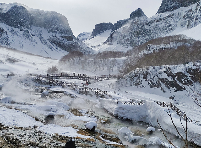 10:50 换乘环保车赴【长白瀑布】,车程约10分钟,步行约20分钟到达长白冰雪瀑布底部近距离观看、摄影,参观聚龙温泉群,周围一片白雪,中间却热气腾腾,甚是美丽,游览30分钟,步行20分钟返回瀑布停车场。