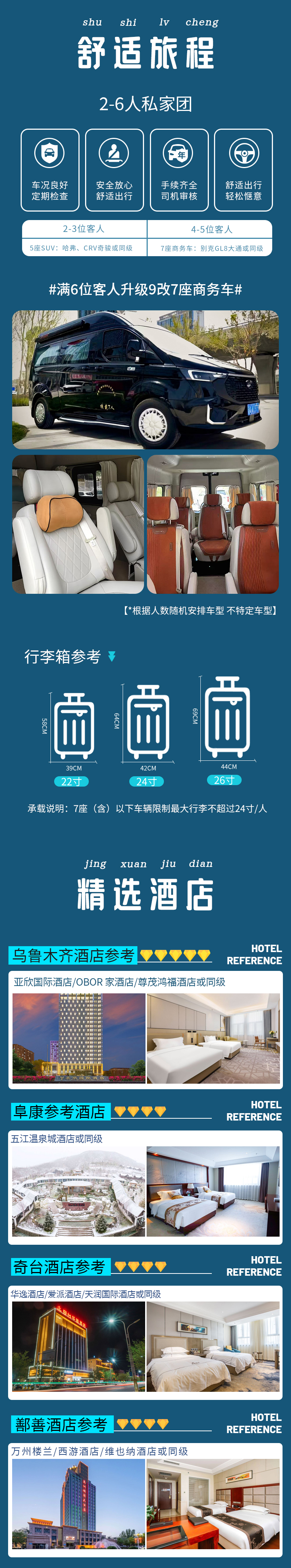 3、用车:2-3位客人用5座SUV,4-5位客人用7座商务车,6位客人用9改7座商务车;