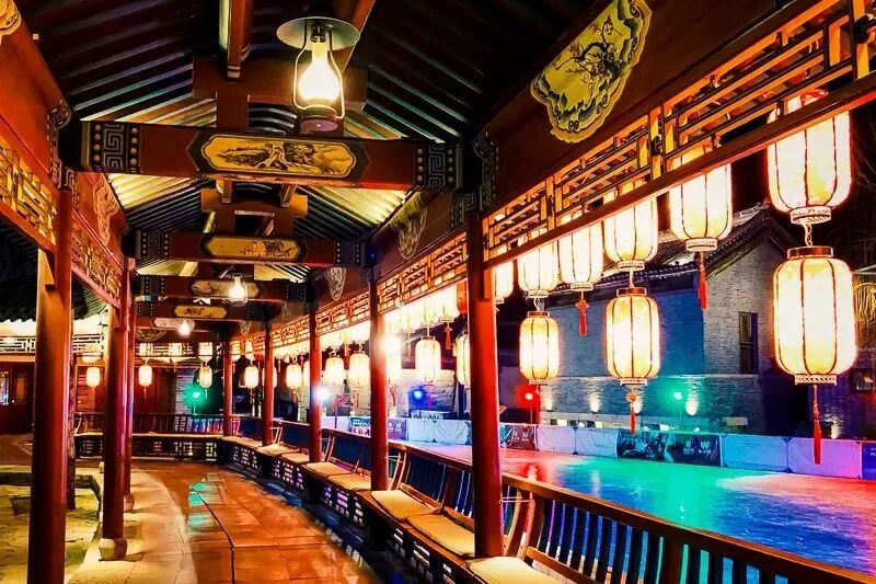 等到夜幕降临,古北水镇如同戴上了金色的薄纱,整个镇子都亮起了金色的光,我们可以到牌楼附近的大戏台看看镇子上免费的表演,也可以尝尝戏台前的小吃摊,这时你就会有种穿越的感觉,坐着宽板凳,听着戏、相声,我们仿佛回到了古代。