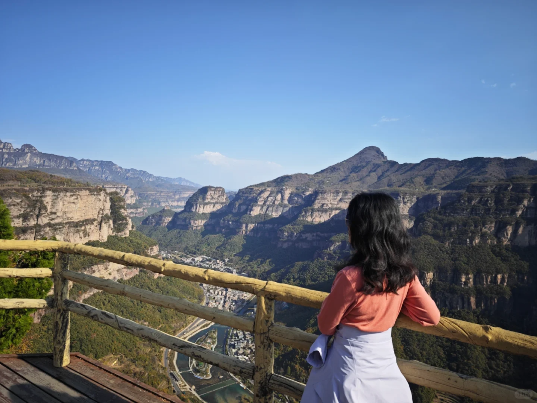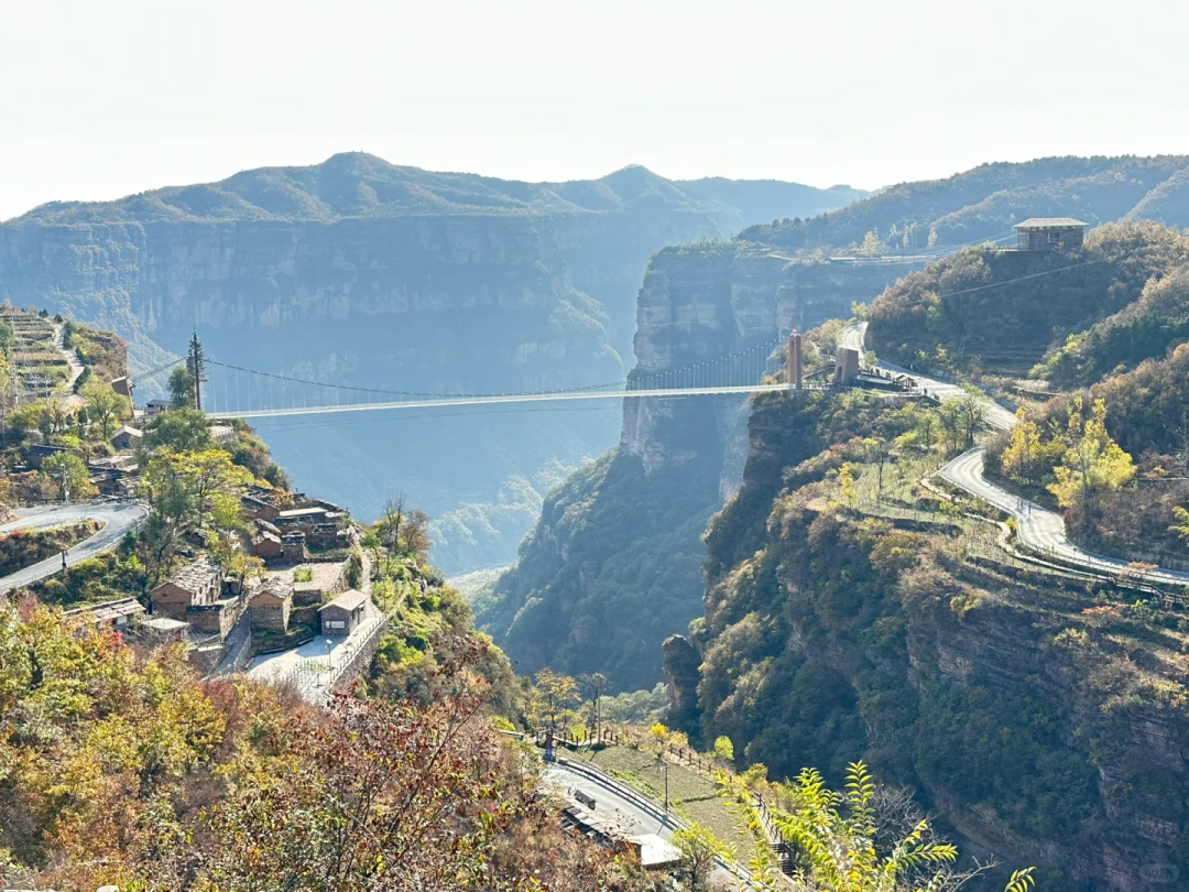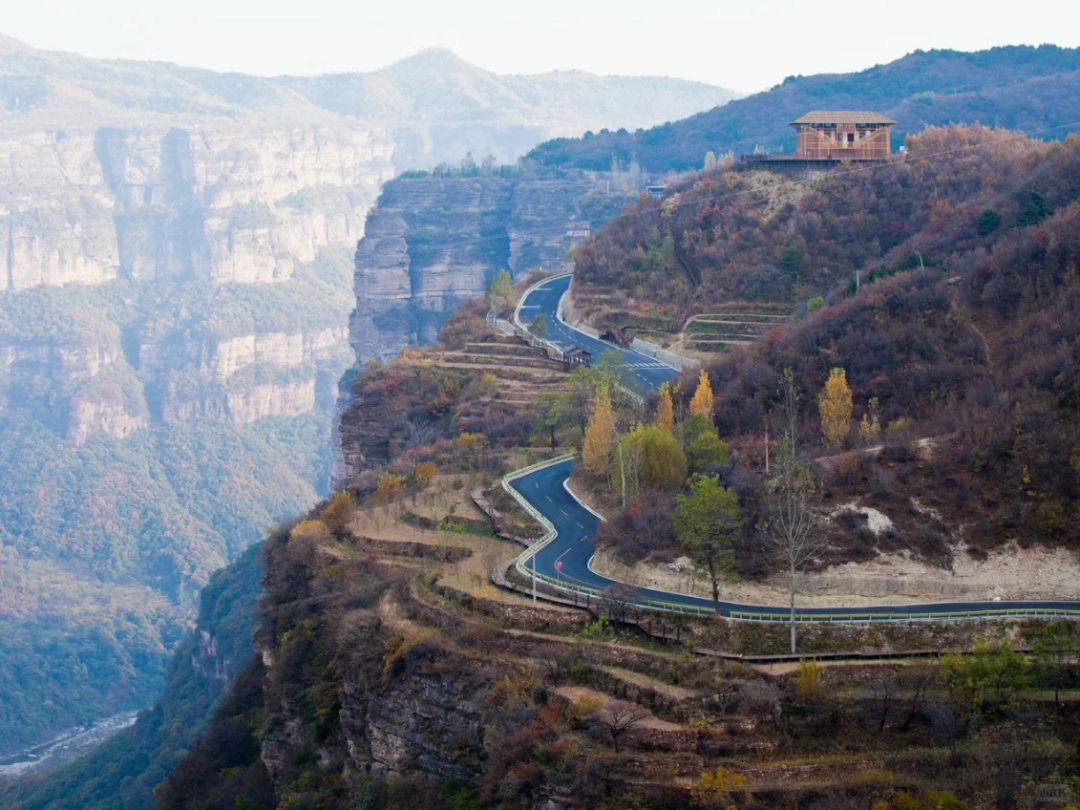 连绵的太行山脉,分成屏风式的两排,相互对望,情意绵绵。太行大峡谷夹在两山之中,弯弯曲曲,渐行渐上,蜿蜒千里。一路随着山势变化,蛇行其间,龙盘在野,抵达观景台后,身处高地俯瞰巍巍太行大峡谷,冰雕玉琢,壮阔之情油然而生。