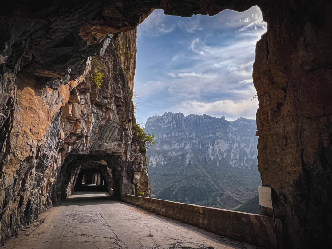 沿着之字山路盘桓而上,我们将来到南太行山区7条挂壁之一的【穽底挂壁公路】,挂壁公路是在悬崖峭壁上开凿而出的,奇险、艰难,在我国筑路史上都很少见。阱底挂壁距山顶和沟底都有上百米,完全悬在半山腰。公路的一侧是坚硬的山体,另一侧就是如刀劈斧削的绝崖峭壁,从隧道洞口向外看风景如画,美不胜收。时间尚早我们将安排大家徒步这条挂壁公路,如果天色已晚,我们将乘车穿过挂壁,途中大家可以下车欣赏傍晚挂壁美景,一个个洞口就像取景框,框住了洞外的美景,将太行山的奇雄壮阔尽收框中。