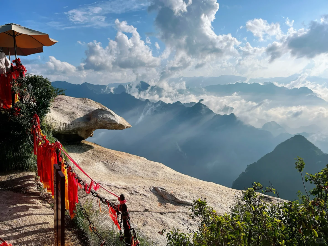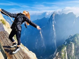 我们乘坐那亚洲最长的缆车到达西峰,你可以坐在缆车上看到脚下险峻的山势,也能看到在攀爬的人们,刺激到爆炸!之后走华山最高峰—南峰炼丹炉、南天门。想寻求挑战的朋友们可以去长空栈道试试,那里只有木板和铁链相连,挂在峭壁之上,仅能通过一人,长空栈道人比较多,需要单独排队,大家自愿尝试。之后我们走东峰,很多人愿意来这里爬鹞子翻身,这里比长空栈道稍微稳妥一点,但也需要绑着安全措施直上直下,能看到下棋亭。之后走天梯,绕回到西峰,坐缆车下山,欣赏这华山的傍晚。