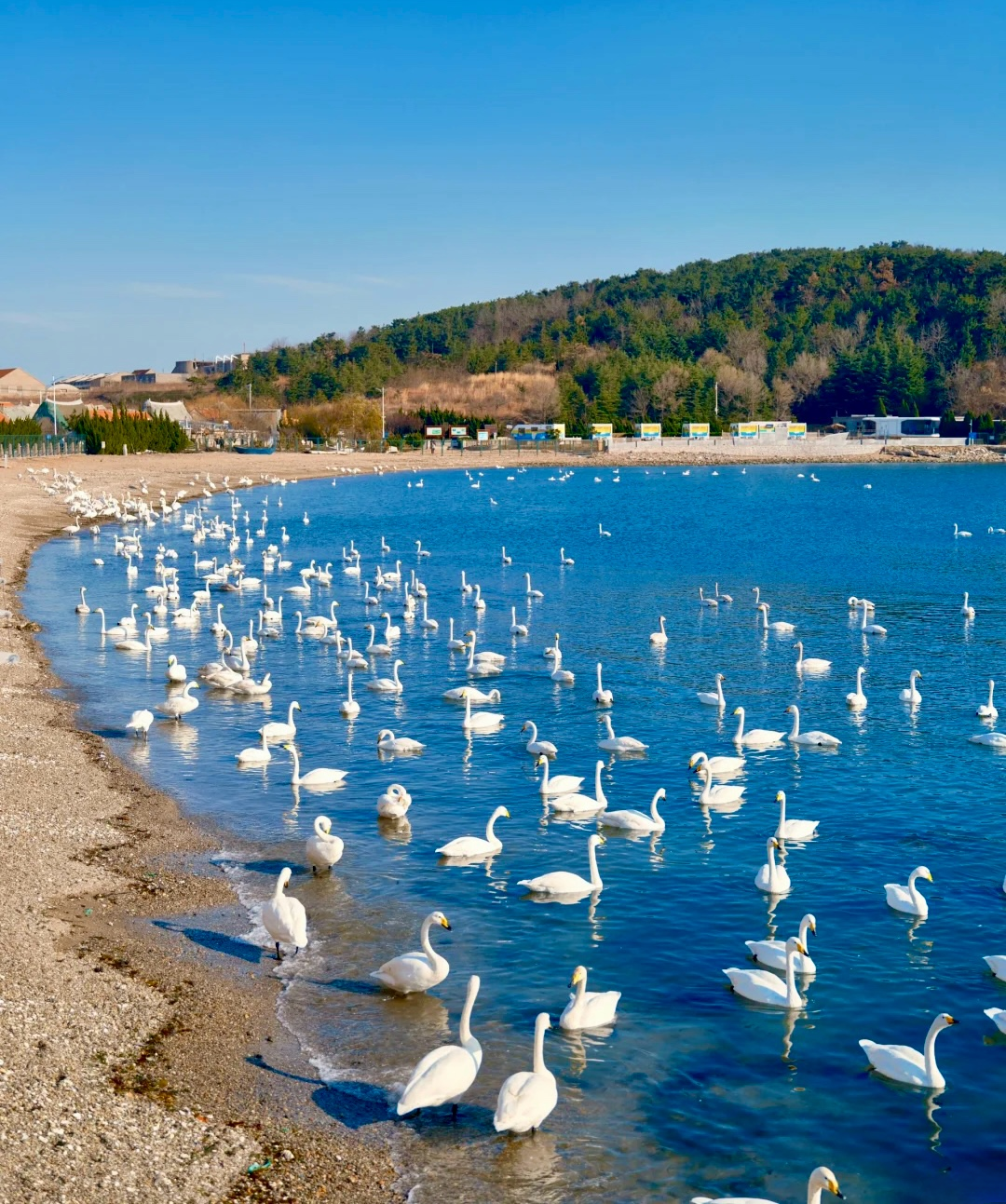 这里是中国最大的天鹅湖,同时为世界上四大天鹅湖之一。天鹅、白雪,冬季的大海别有一番美丽。整个观天鹅海岸线约3公里,终点到花斑彩石参观,花斑彩石是五亿多年前寒武纪燕山期火山喷发的火山岩。黄昏时我们在村里拍摄海草房及日落,这是所有摄影爱好者最喜欢的时段。