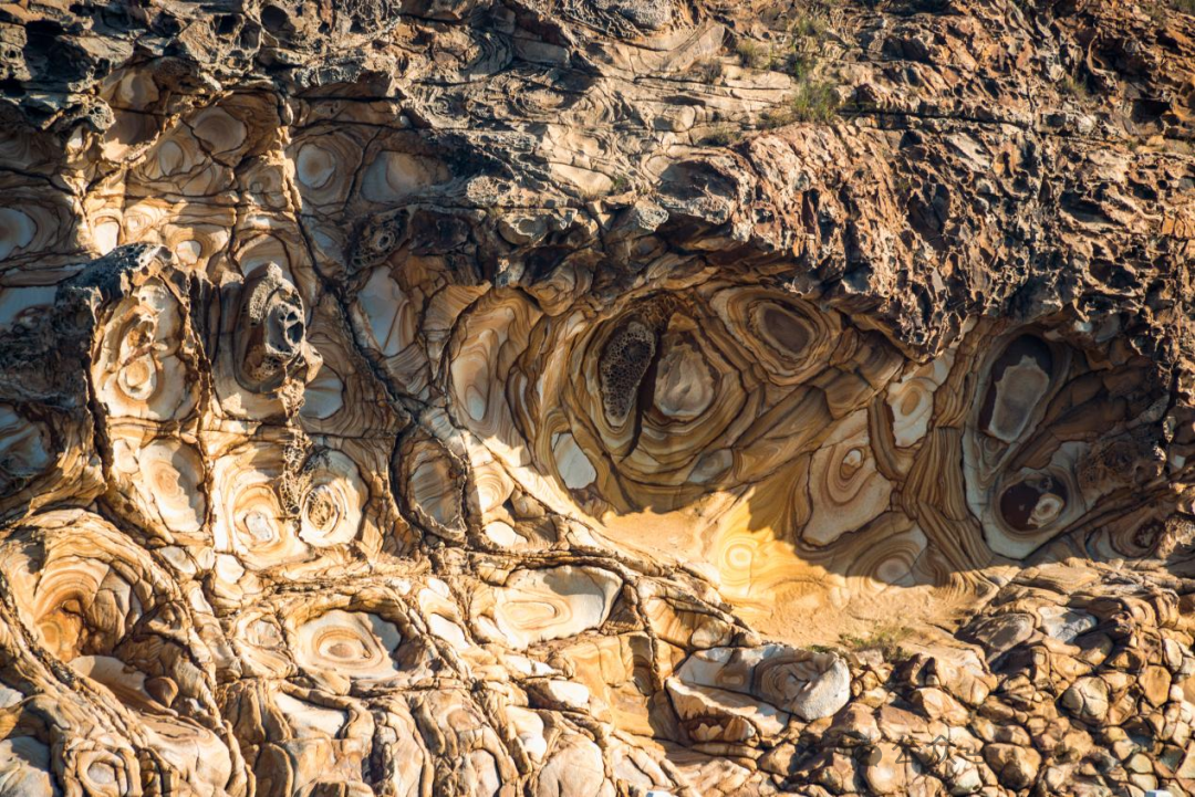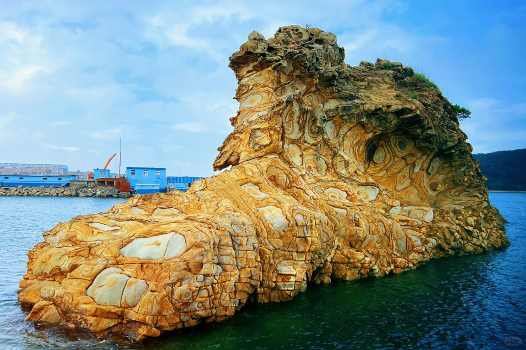 去烟墩角,还可以观赏一下花斑彩石。相传是女娲补天之五色石遗落海中化成。实际上此石为古生代寒武纪燕山运动所形成。彩石天然独特的形态,有中华海上第一奇石的美称。花斑彩石位于马道镇烟墩角村东南方海中,距岸50多米,长约35米,宽约20米,高约9米,花斑彩石主要由黄、白、褐三种颜色组成。