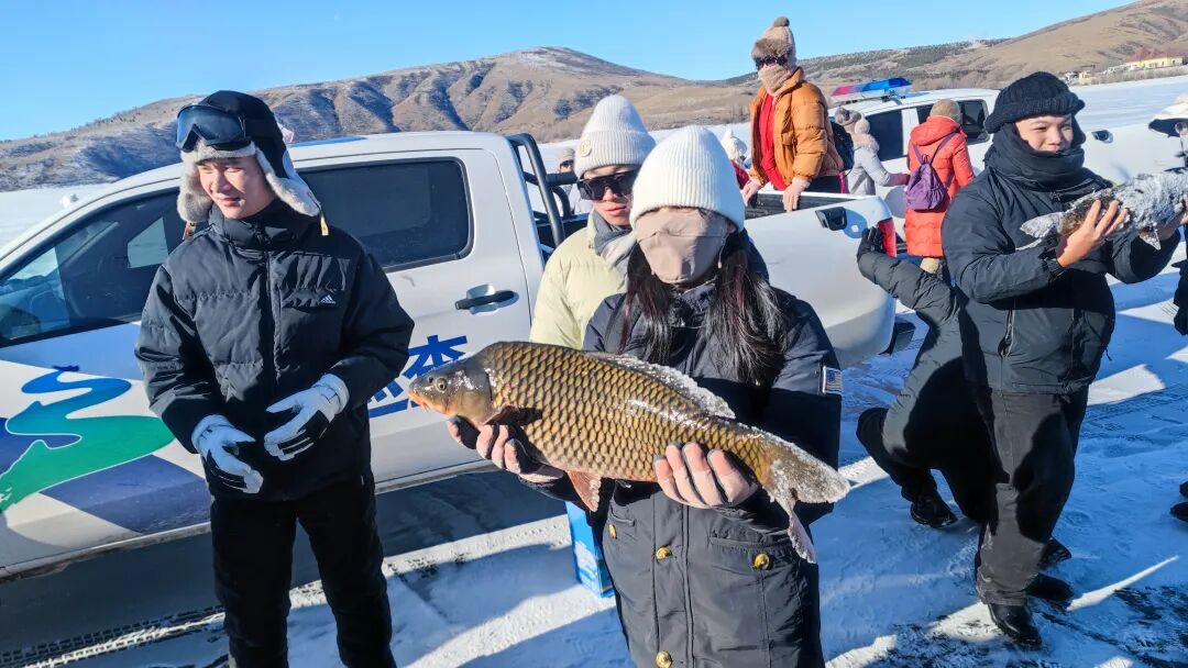 多伦湖的冬捕,延续了古老的千年渔猎文化,早在一千多年前的辽金时代,这里就已盛行冬捕,直到今天,冰上渔猎仍然是当地传统的生产习俗。渔民们打眼、破冰、下网,水下走杆,一招一式按照传统步骤逐一还原冬捕过程。