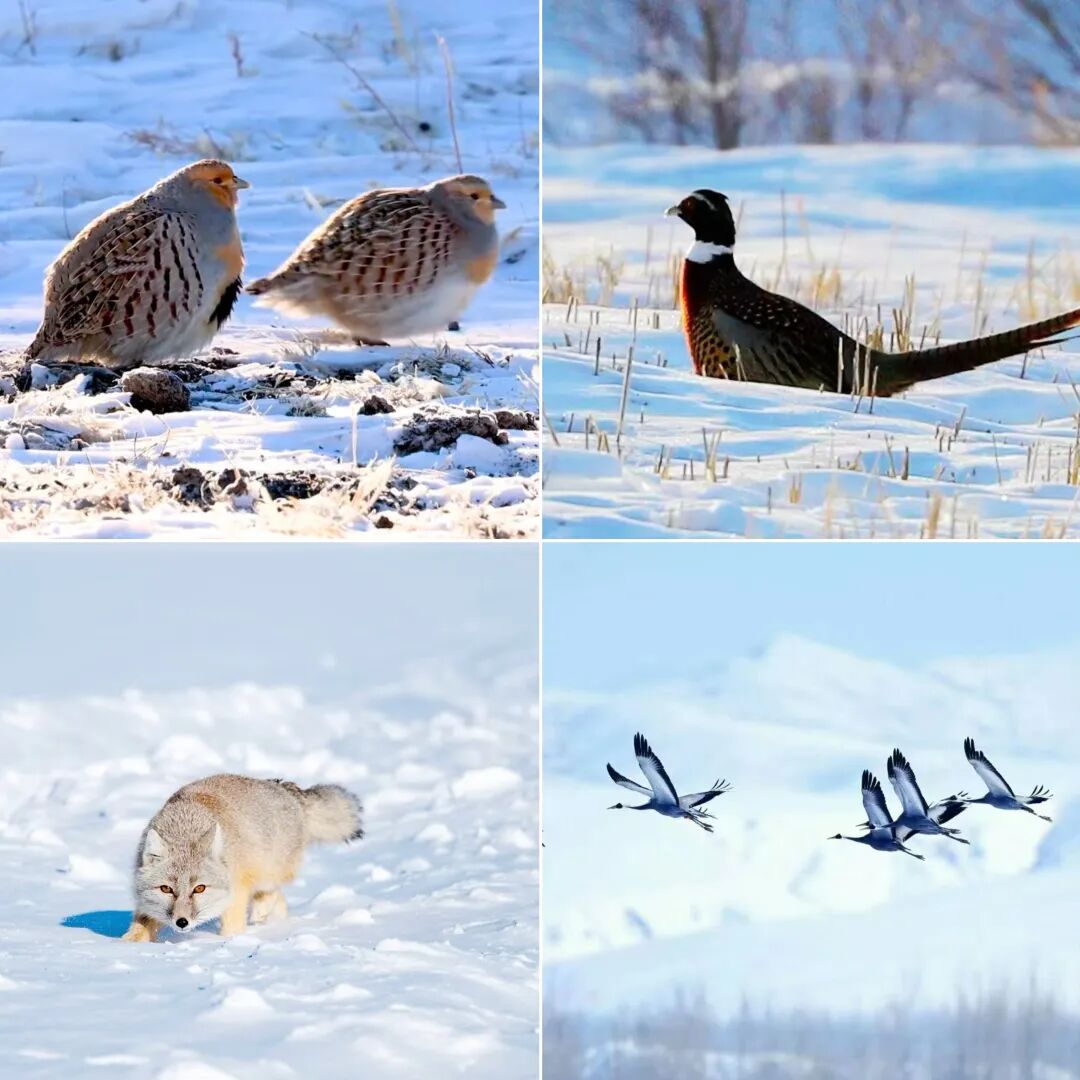 越野车经过的路上我们经常可以看到在雪原上撒谎觅食的小动物,野鸡、狐狸、沙半鸡、野兔子、土拨鼠等等国家保护动物。